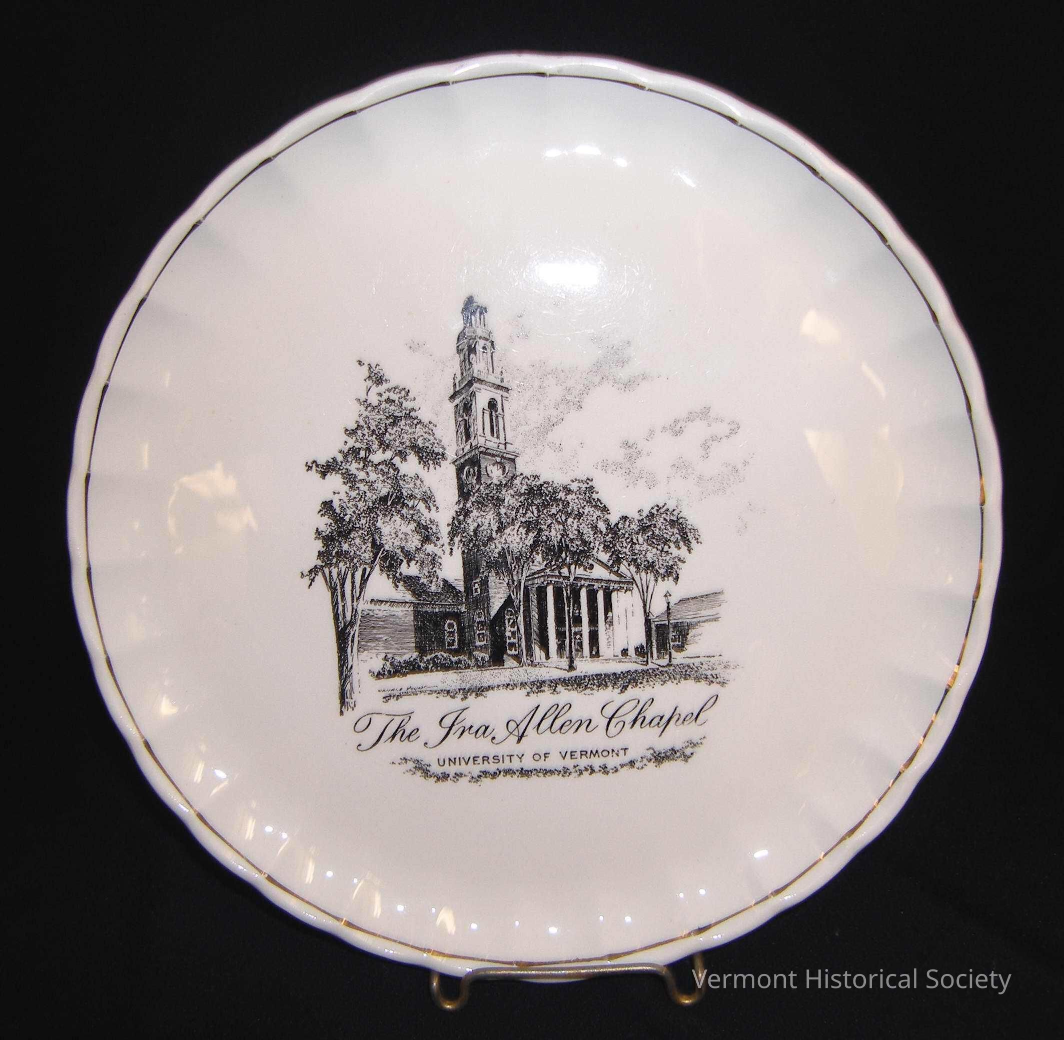 White ceramic plate printed in the center with an illustration of a building with a tall bell tower and a columned portico. The image is labeled, "The Ira Allen Chapel UNIVERSITY OF VERMONT". The bottom is marked, "Balfour CERAMIC ATTLEBORO MASSACHUSETTS".