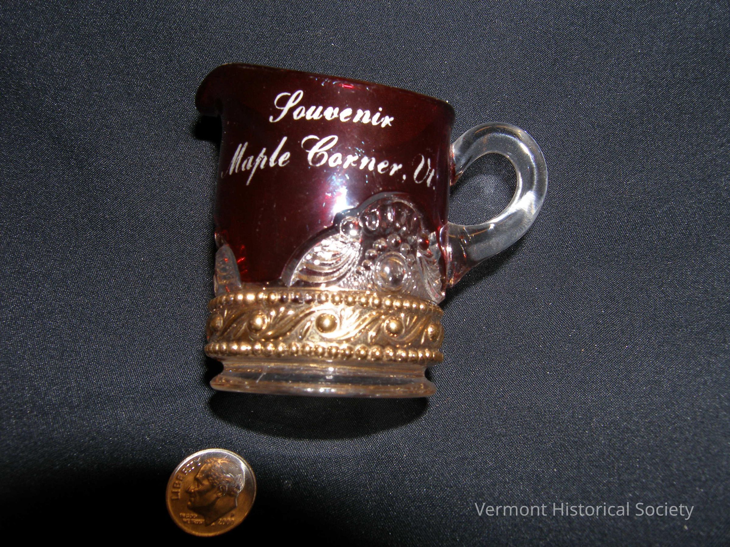 Red molded glass cream pitcher. The pitcher has a small, clear glass handle and straight sides. The bottom portion is molded with scrollwork in clear glass and a portion of the molded design is gilded. One side of the pitcher is printed with the white inscription, "Souvenir Maple Corner, Vt."