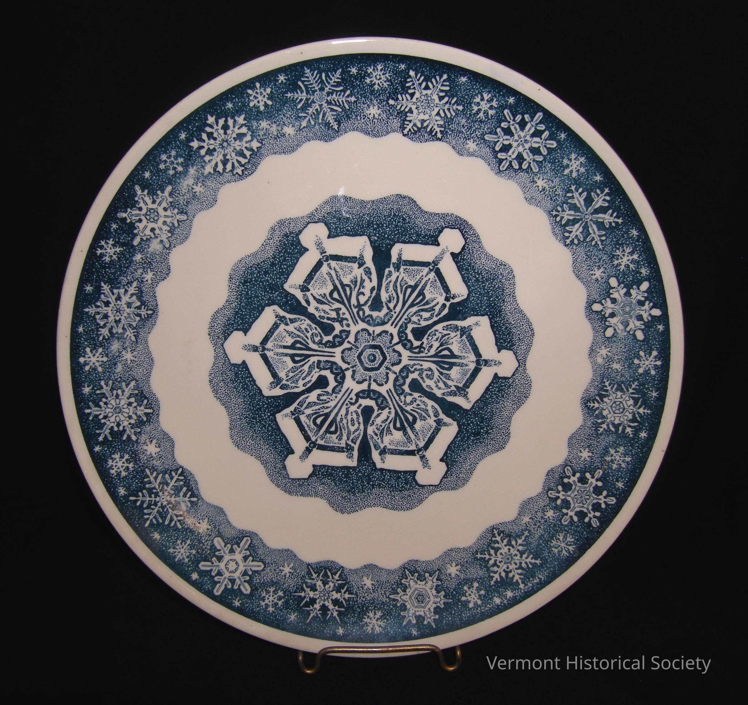 White ceramic plate printed in blue with a border of snowflakes and a large, center snowflake. The back is printed with a four-paragraph list of famous people and sites of Jericho, Vermont. It is marked, "Made for, Hooper Advertising Service Albany, N. Y. / Kettlesprings Kilns . . . R. O. I Alliance, Ohio 1261".Context