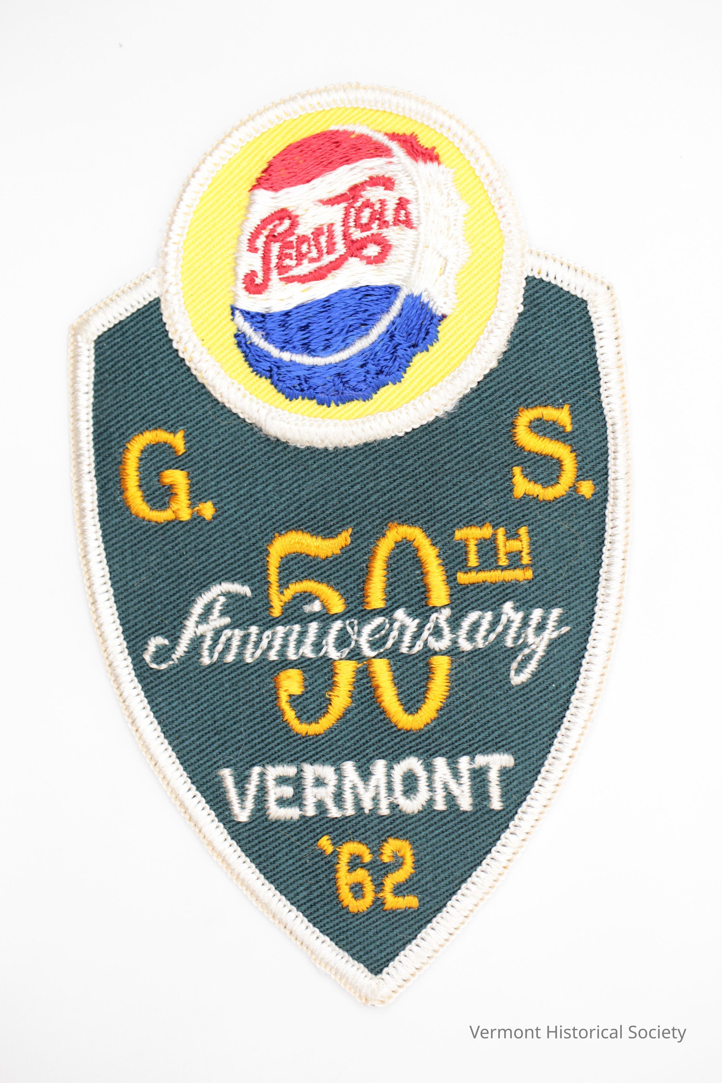 Embroidered patch in the shape of a shield. In a circle at the center top is a red-white-and-blue bottle cap with the label, "PepsiCola". The cap is on a yellow ground. The shield is made from twill-woven green fabric and embroidered with the inscription, "G. S. 50TH Anniversary VERMONT '62".
