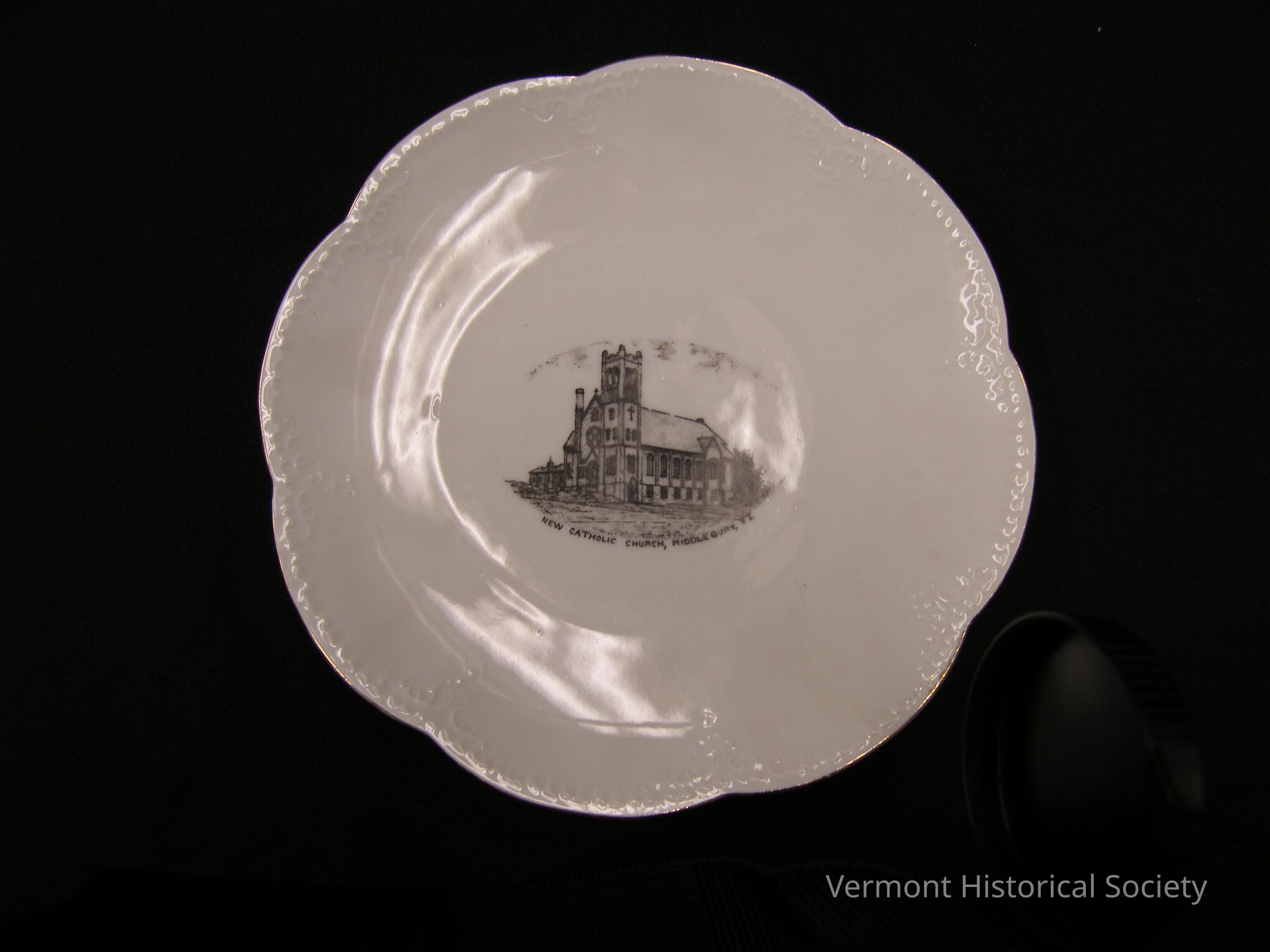 White ceramic saucer with scalloped edges. The saucer is printed in the center with an engraved illustration of a church with a tall square tower on the front corner. The image is labeled, "NEW CATHOLIC CHURCH, MIDDLEBURY, VT." The bottom of the dish is marked, "Made in Austria for G. E. Marshall, Middlebury, Vt. Vienna."Context