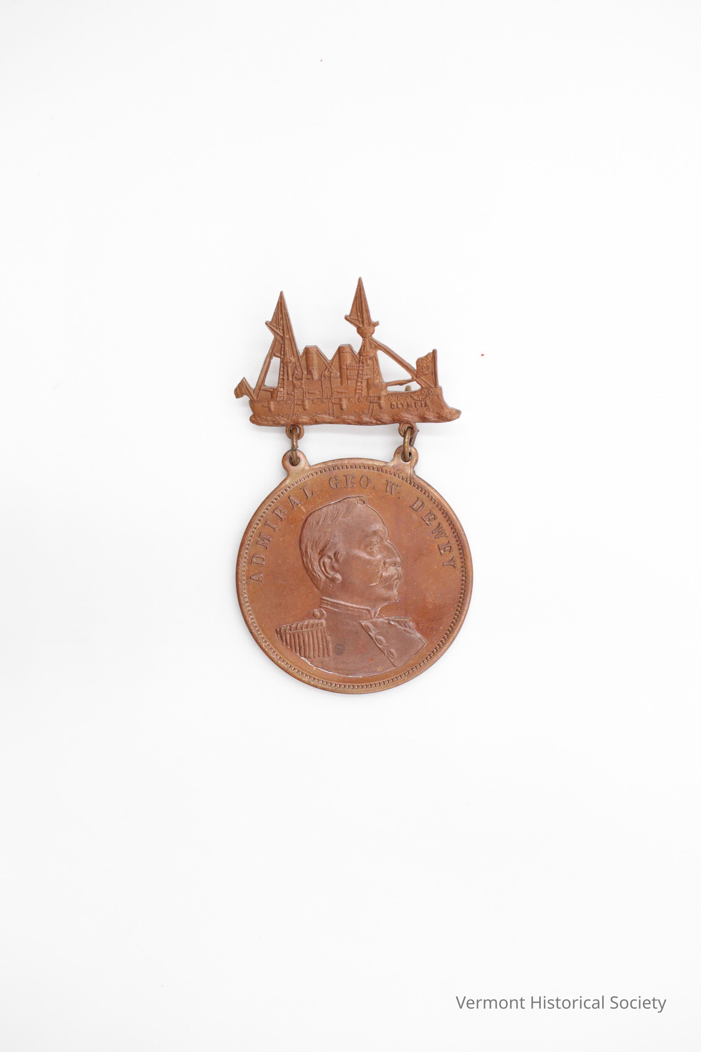 Commemorative medal consisting of a bar in the shape of a warship and a round medallion. The front of medallion has a bust of a man and the inscription, "ADMIRAL GEO. W. DEWEY". The back of the medallion shows a warship with two chimneys and two masts and has the inscription, "DEWEY'S FLAG-SHIP OLYMPIA 5,800 TONS".Context