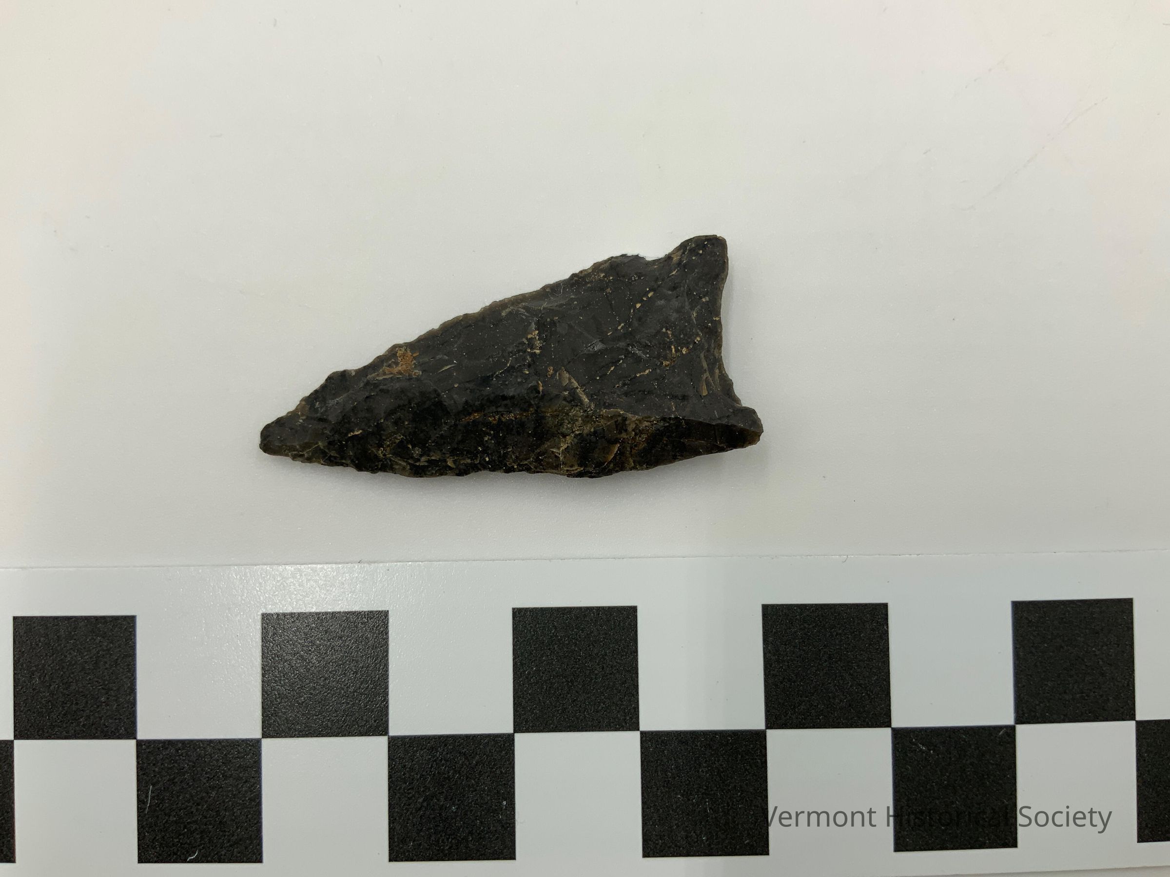 Grey chipped stone projectile point with one side notch. The base curves inward, and the blade edges are straight.Context