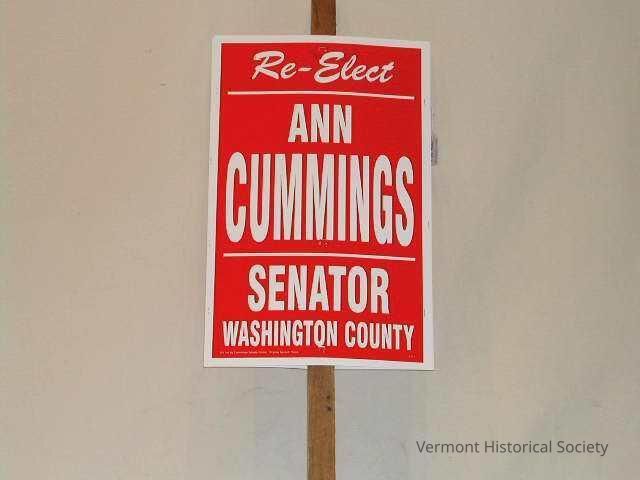 Red campaign side on a wooden stake. It is printed with the white words, "Re-Elect ANN CUMMINGS/ SENATOR WASHINGTON COUNTY," in white letters. The sign is double-sided.