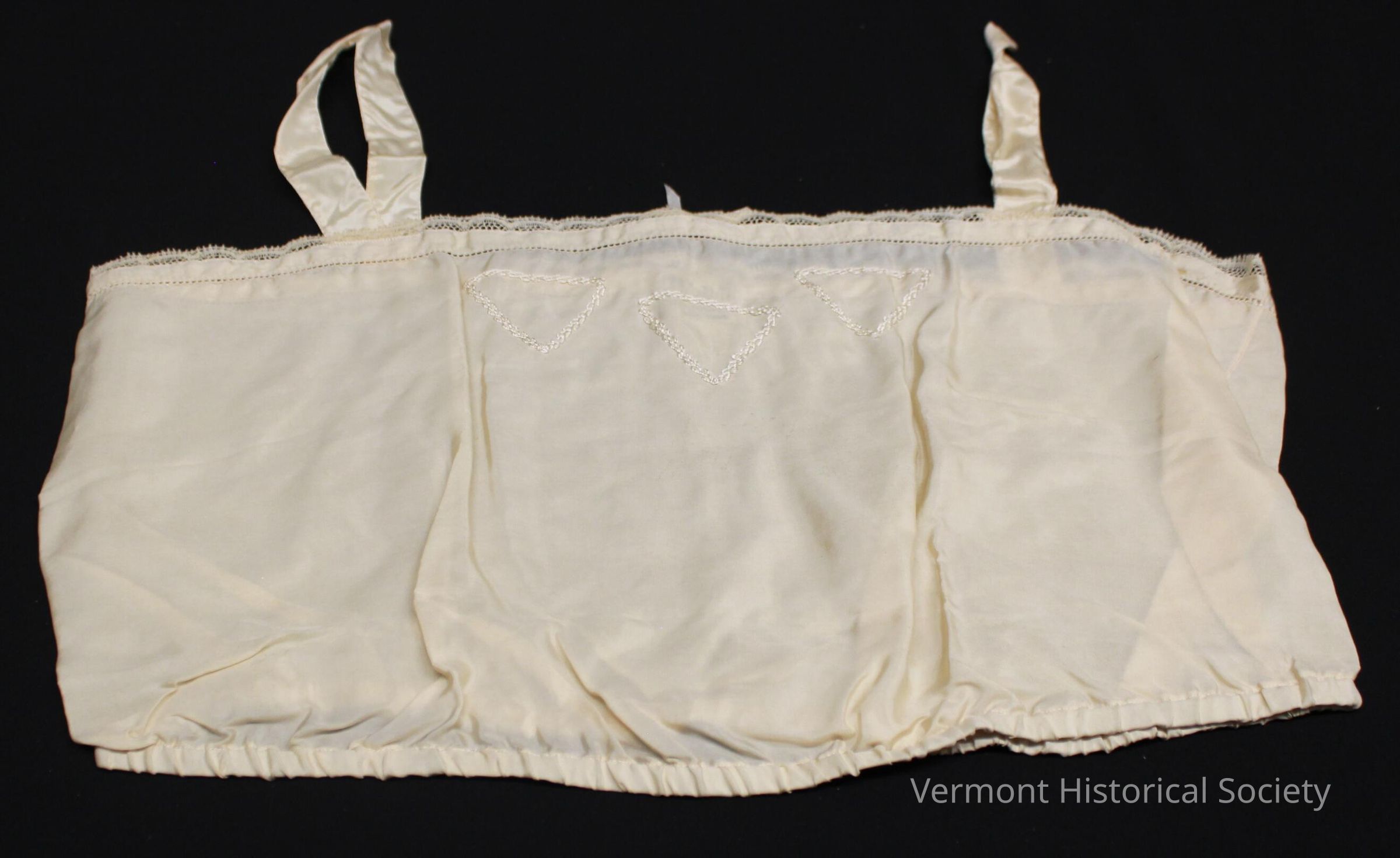 Silk camisole with encased elastic around the bottom. There are 3 triangles embroidered at the center front. The straps are made from silk ribbons. The top is edged in narrow scalloped lace. There is a tag sewn into the back that reads, "B. Altman & Co."Context