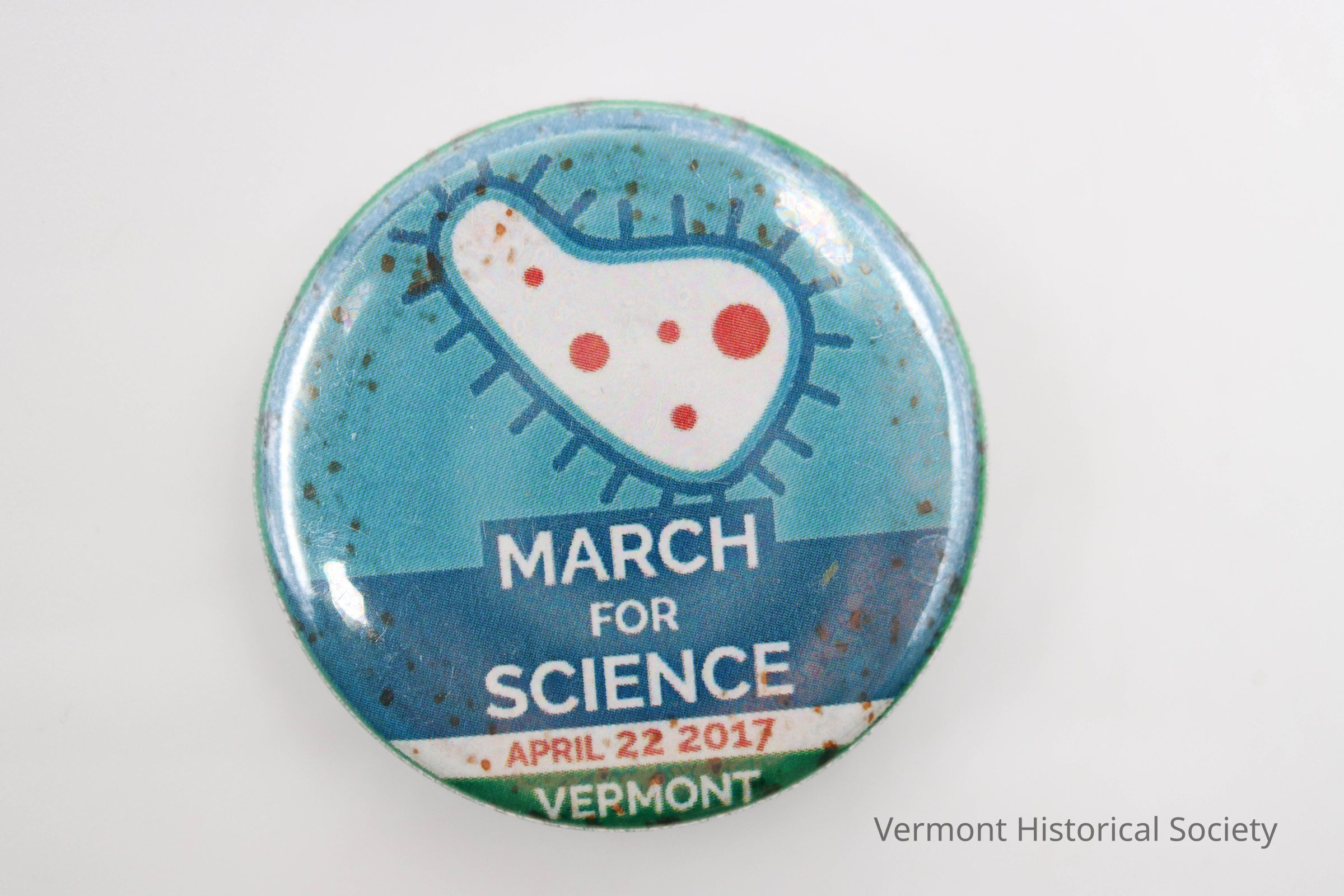 Round metal button. The front is printed with a blue ground and an image of an amoeba with the words, "MARCH FOR SCIENCE / APRIL 22 2017 / VERMONT."Context