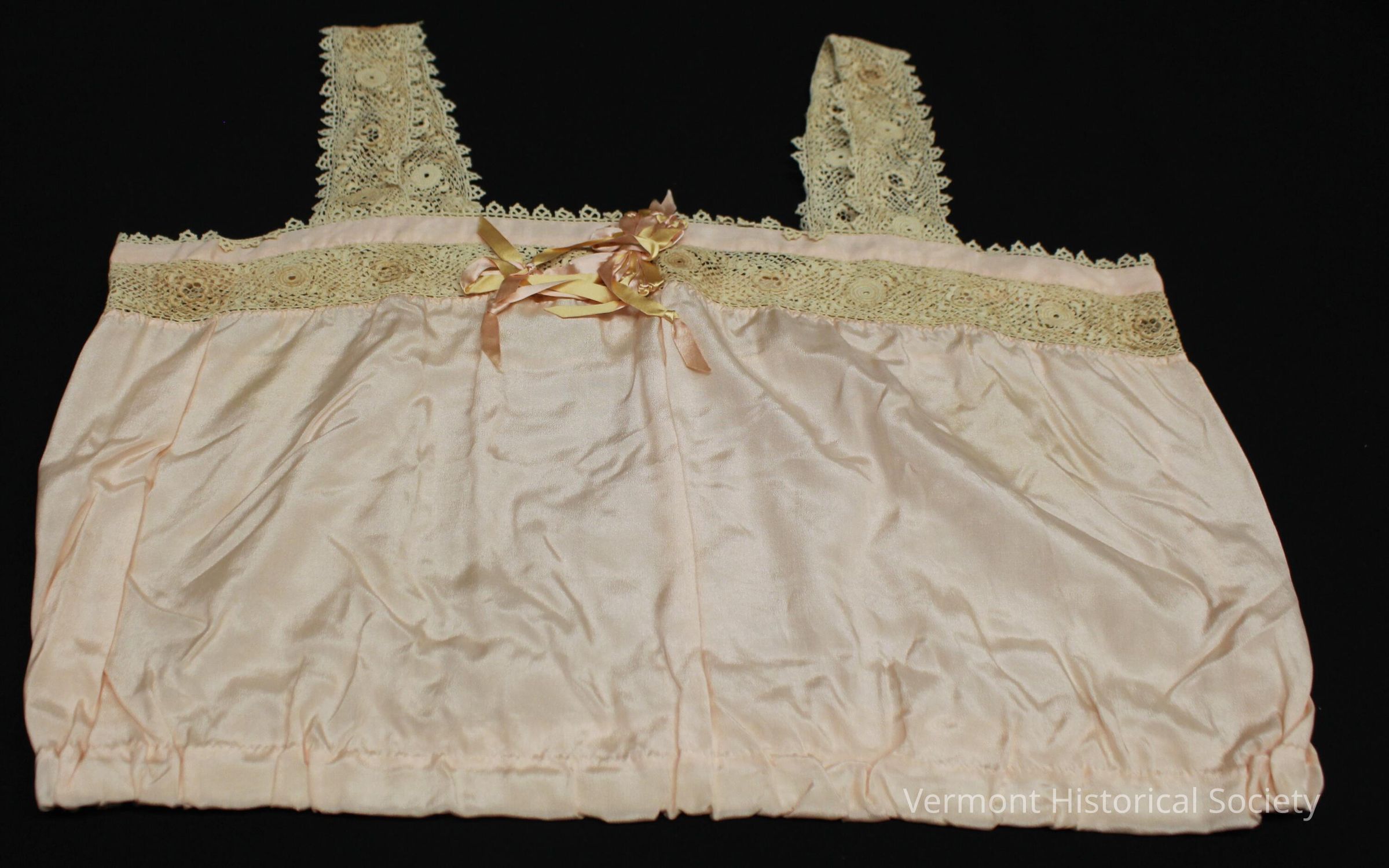 Pink silk camisole with cream-colored inserted crocheted lace. The same lace forms the should straps. There is a pink ribbon bow at the center front. The bottom has encased elastic.