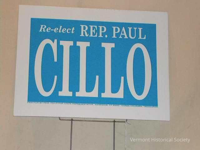 White campaign sign printed with a light blue rectangular field with white lettering that reads, "Re-elect REP. PAUL CILLO".