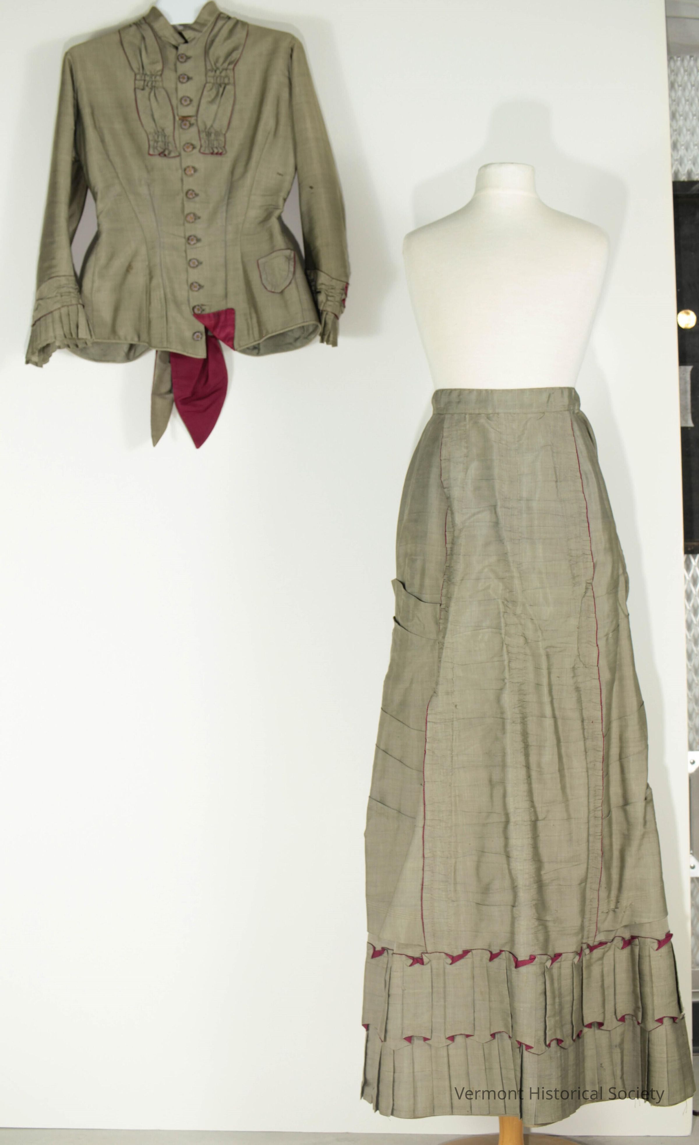 Two-piece dress consisting a bodice and skirt of shot grey silk taffetta. The bodice is buttoned down the center front with self covered buttons. The bottom corner of the center opening is turned out and tacked in place, showing the burgundy facing material. There is a small applied pocket at the proper right hip. The 3/4-length sleeves are trimmed with pleats. A small applied faux scarf or collar is tacked around the neckline and down the front. The back of the bodice is decorated with two burgundy-faced tails. The skirt is cut to accommodate a bustle. The seams are piped with burgundy silk, and the bottom is trimmed with box pleats of self fabric faced with burgundy.Context