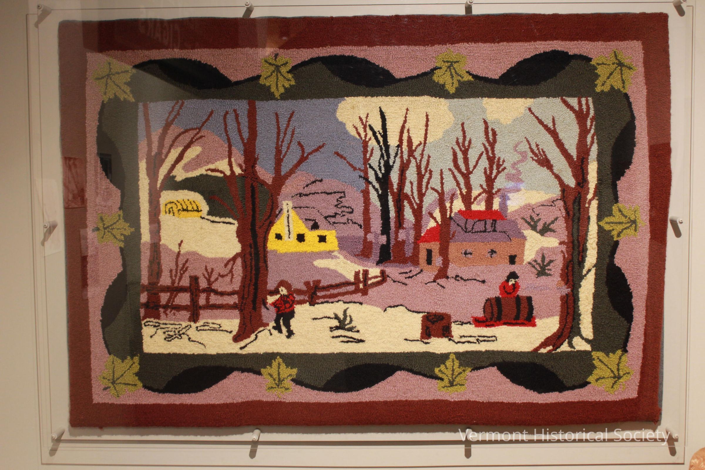 Tufted or punch needle rug made of wool yarn with linen canvas backing. The rug shows a traditional Vermont sugaring scene including (from left to right) a barn, a tree being tapped, a farm house, tapped trees with metal buckets, a sugar house with steam rising from the vent, and a wooden collection tub on a sled. The rug has a purple and maroon border that includes green maple leaves.