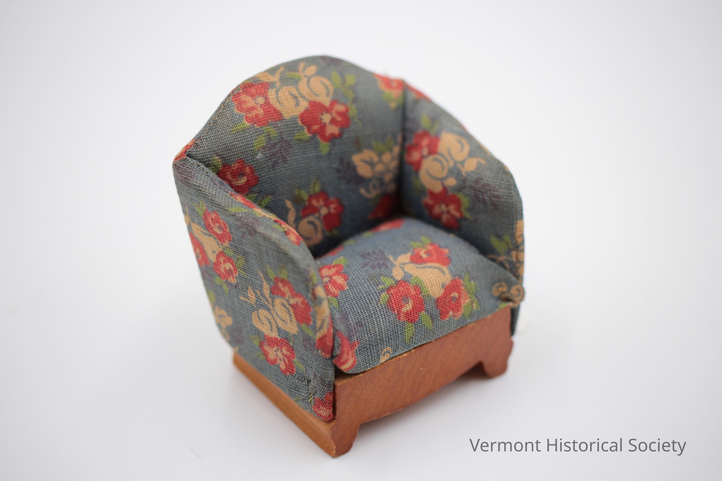 Miniature upholstered armchair. The base of the chair is wood and the upper portion is upholstered with blue cotton printed with red and white flowers and fruit.Context