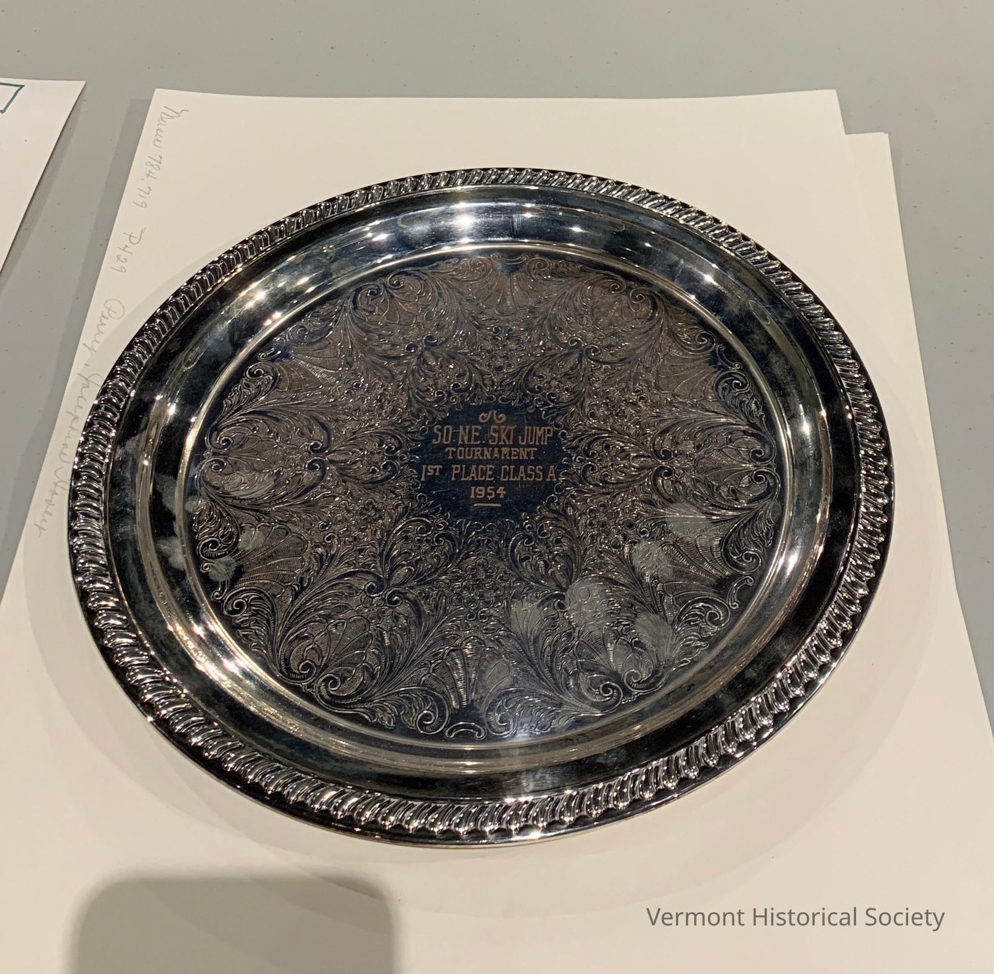 Silver-plated salver with copper base metal. The flat surface features an intricate leaf decoration etching and the edges have a gadrooned border. The center of the plate has a polished center circle bearing the inscription, "SO. NE. SKI JUMP / TOURNAMENT / 1ST PLACE CLASS A / 1954."Context