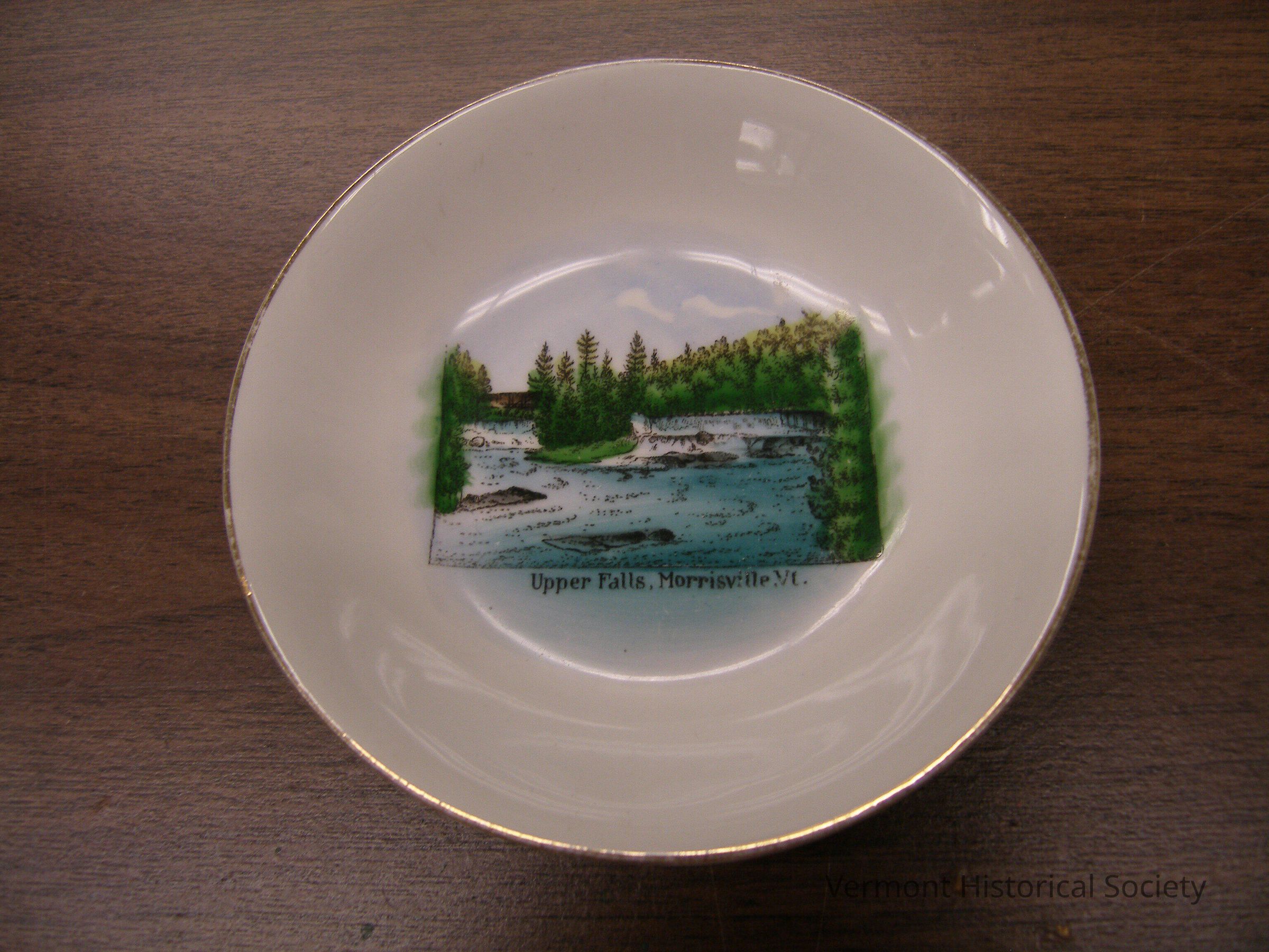 White ceramic bowl printed in the center with a full-color illustration of a river with short waterfalls surrounded by trees. Outline of the scene is square, but both the green and blue have run out of the lines. The image is labeled, Upper Falls, Morrisville, Vt." The bottom of the bowl is marked, "MADE IN GERMANY FOR E.A. HASTINGS MORRISVILLE, VT."Context