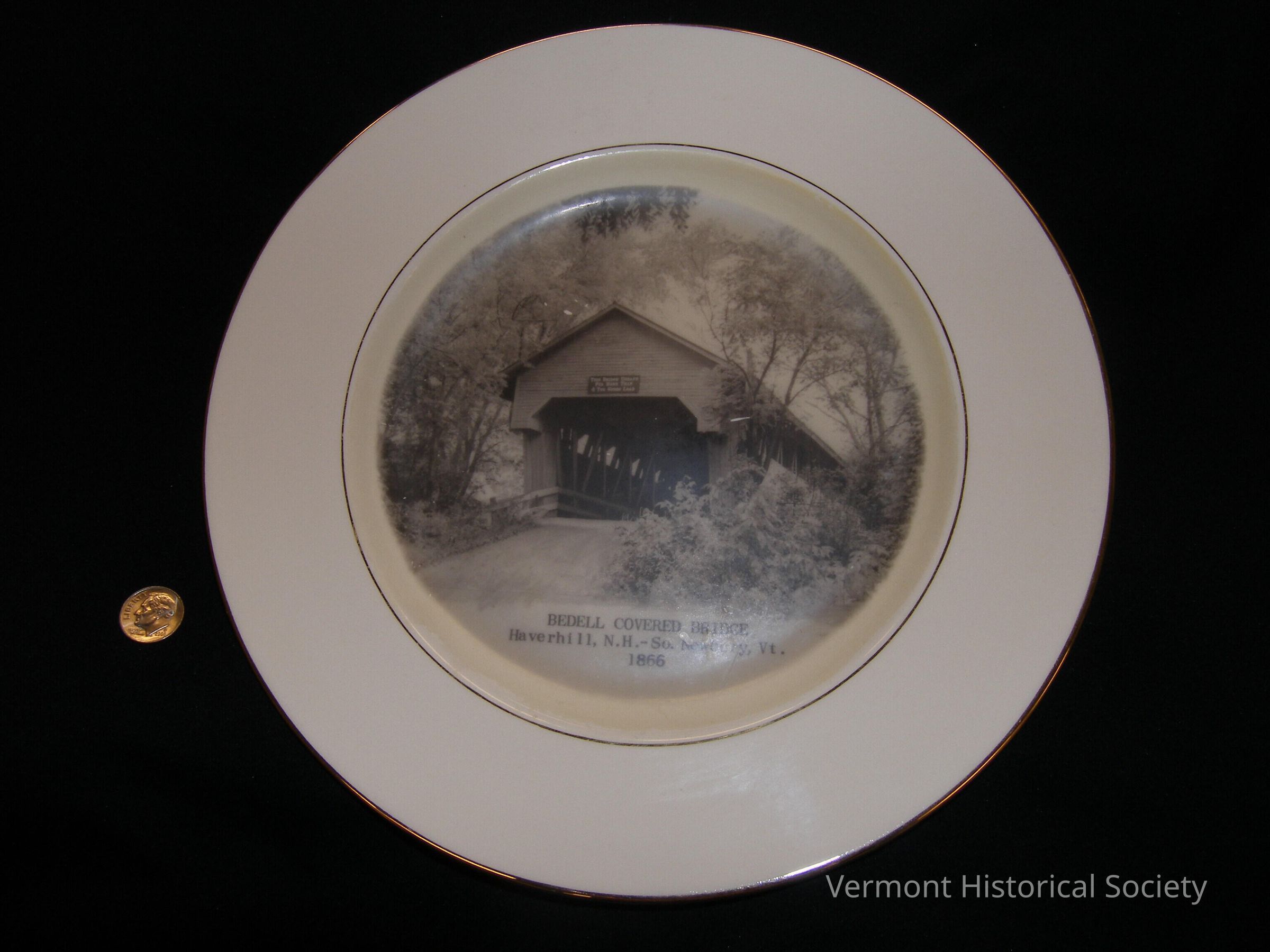 White ceramic plate printed in the center with a black-and-white photograph of a covered bridge. The picture is labeled, "BEDELL COVERED BRIDGE Haverhill, N.H.-So. Newbury, Vt. 1866". The picture is surrounded by a line of cream and a line of gilding. The bottom of the plate is marked, "Preston-Hopkinson Co. Appomattox, Virginia."Acquisition