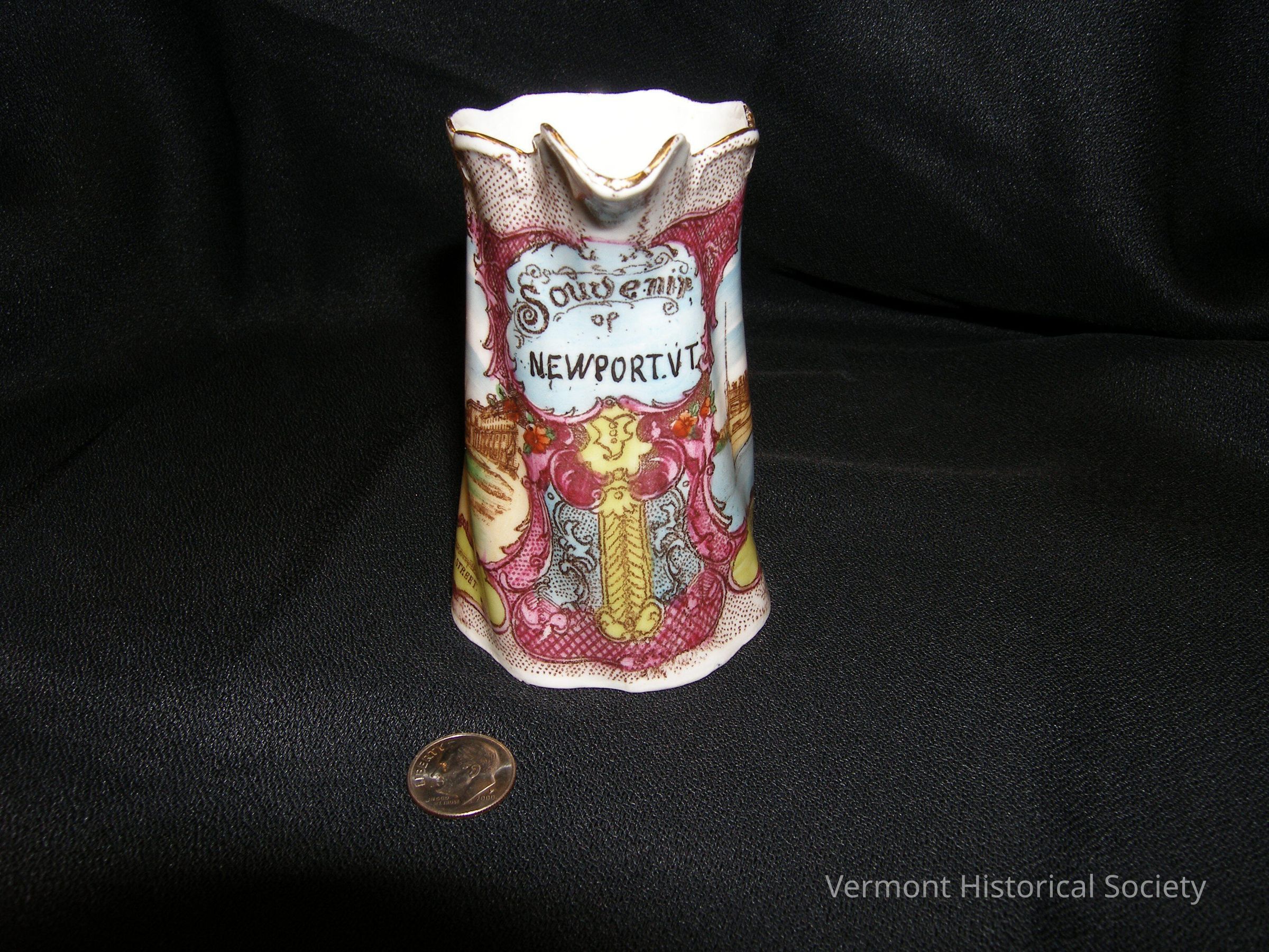 White ceramic cream pitcher printed all over with bright colors. The main design is separated into three cartouches: the sides show a steamboat and a city street, and the center says, "Souvenir of NEWPORT.VT." The side images are labeled "Lady of the Lake, Lake Memphremagog" and "Mains Street" respectively/ Between the cartouches the pitcher is decorated with pink, yellow, and blue scrollwork.