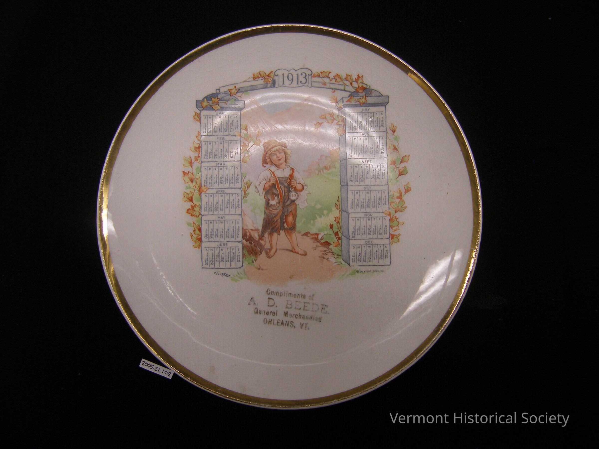 Advertising calendar plate for the year 1913. The plate shows a young boy in patched overalls standing beneath an archway. The side pillars of the arch are printed with the calendar for the year 1913 separated into months. The bottom center is labeled, "Compliments A. D. BEEDE General Merchandise, ORLEANS, VT."