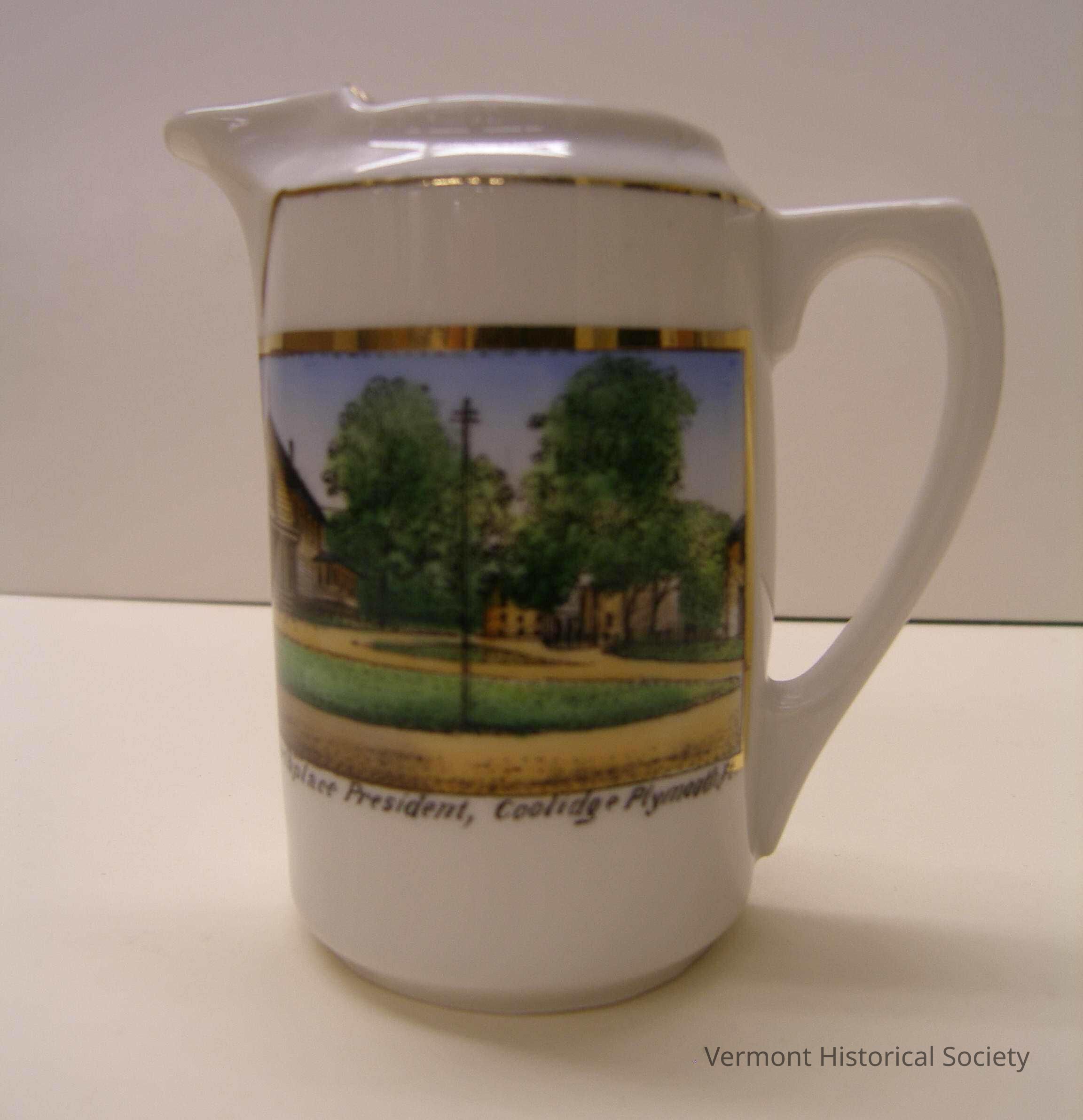 White ceramic cream pitcher printed on one side with a full-color illustration of a park. The image is labeled, "Birthplace President Coolidge Plymouth, Vt." The bottom is marked, "Made in Germany for Ruth M. Aldrich, Plymouth, Vermont."
