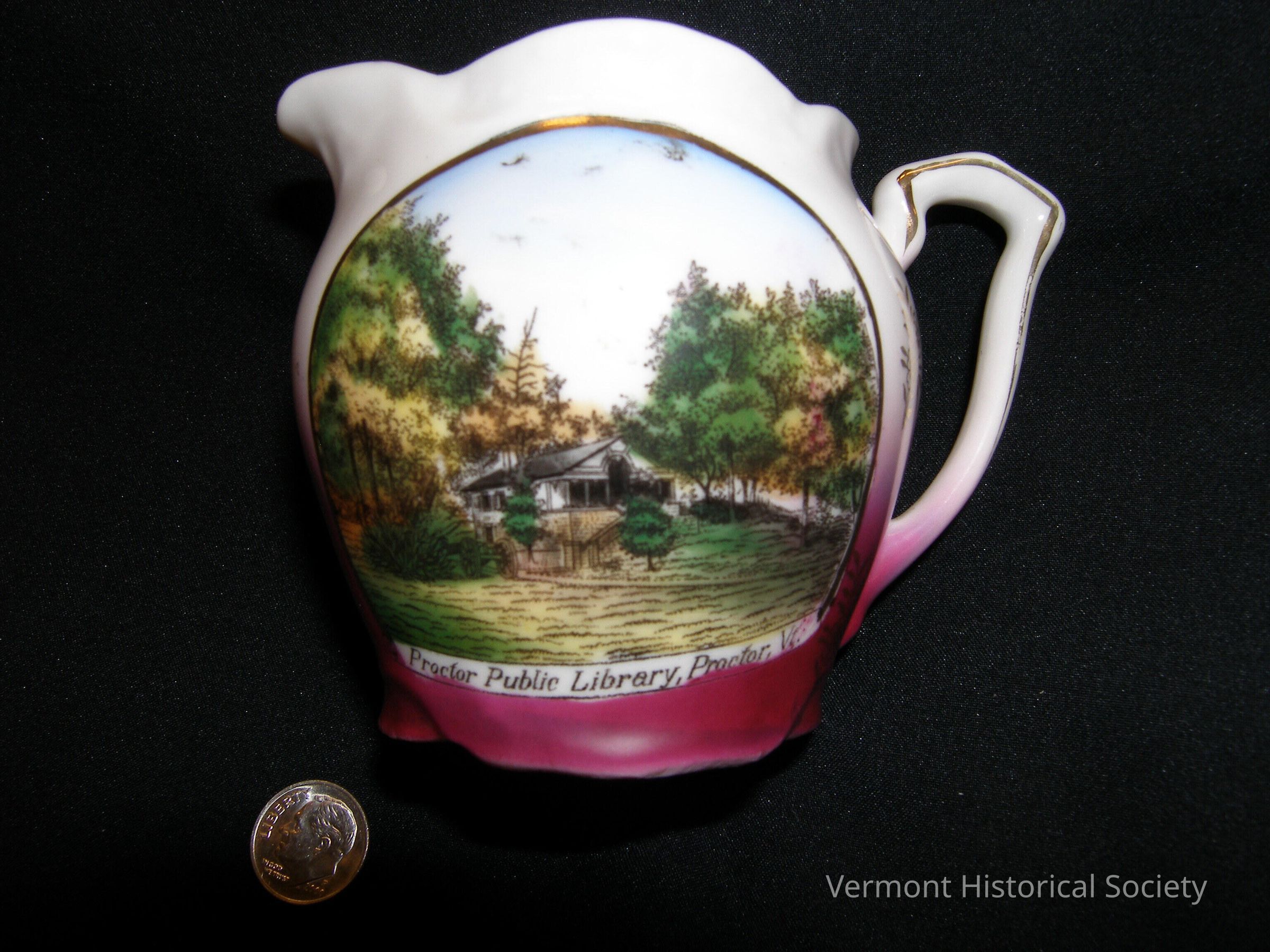 White ceramic cream pitcher with matter pink glaze on the bottom half. One side is printed with a full-color illustration of a building set on a hill amid trees. The image is labeled, "Proctor Public Library, Proctor, Vt." The bottom is marked, "WHEELOCK Made in Germnay for Vermont Marble Co's Store Proctor, Vt."