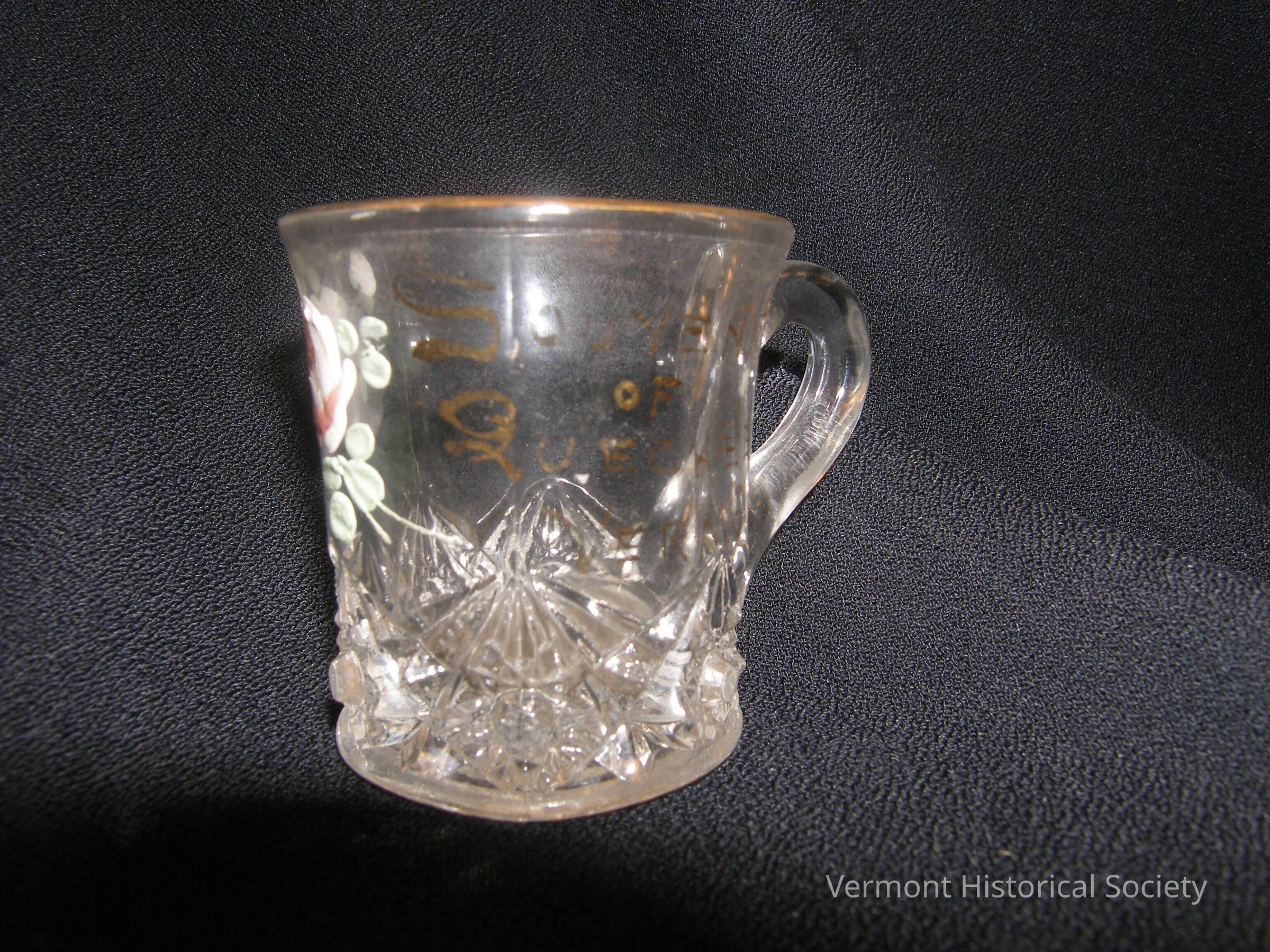 Molded clear glass toothpick holder in the shape of a mug. The base and handle are clear glass, and the base is molded into facets to imitate cut crystal. The upper portion of the cup painted with the gold inscription, "Souvenir of Quechee, Vt." as well as a pink, white, and green rose.Acquisition