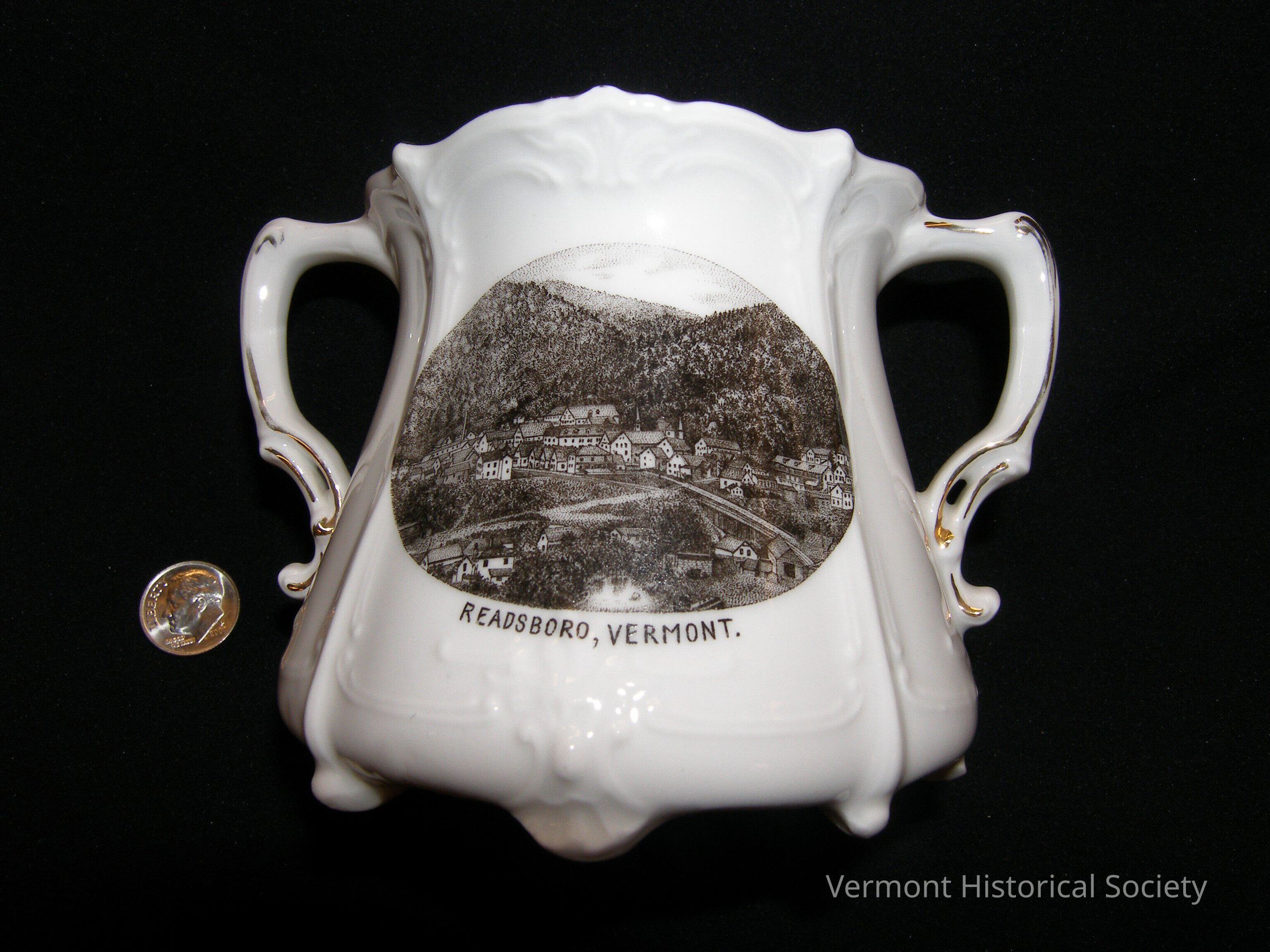 White porcelain sugar bowl with two handles. The bowl sits on 6 small feet. It narrows in the upper portion before flaring at the rim. One side of the bowl is printed with a scenic illustration of a town seen from above. The town is in a valley with rolling mountains behind. The image is labeled, "READSBORO, VERMONT." The bottom of the bowl is marked, "MADE IN GERMANY FOR H. T. GOODELL, READSBORO, VERMONT."Context