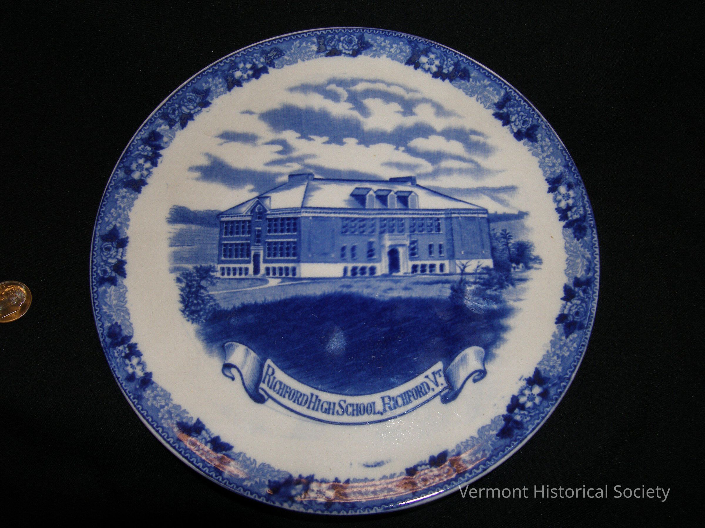 Blue-and-white transfer printed plate or trivet. The plate is printed with a narrow floral border and an image of a large, institutional building in the center. The image is labeled, "Richford High School, Richford, Vt." The plate is marked on the reverse, "THE ADAMS SOUVENIR SERIES W. ADAMS & SONS TUNSTALL, ENGLAND, EST. 1917 MADE IN ENGLAND FOR THE SEARS STORE, RICHFORD, VT."Context