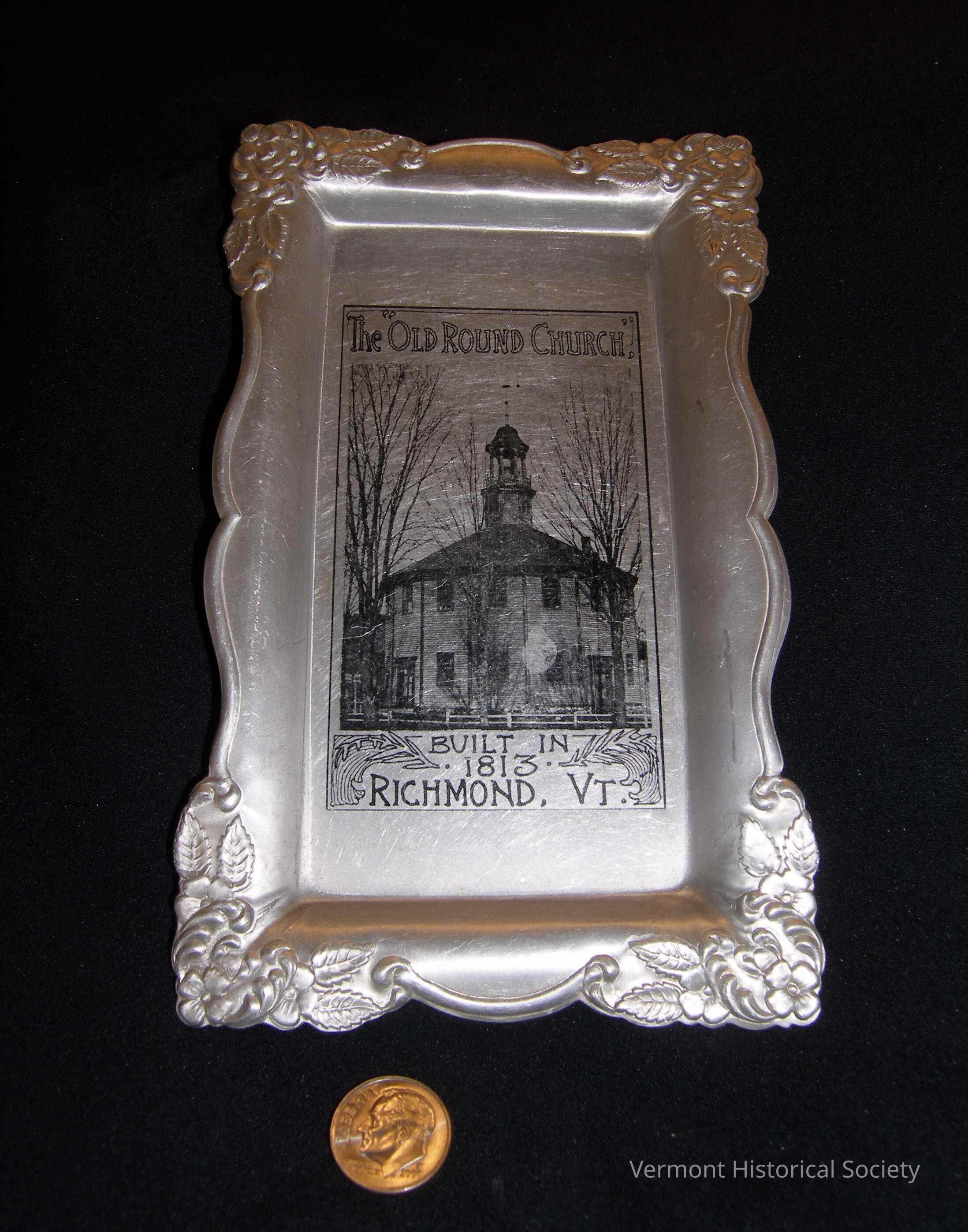 Punched metal card receiver tray. The tray is engraved with an image of a round building with a central bell tower. The image is labeled, "The "Old Round Church"" at the top and "BUILT IN 1813 RICHMOND, VT." on the bottom.
