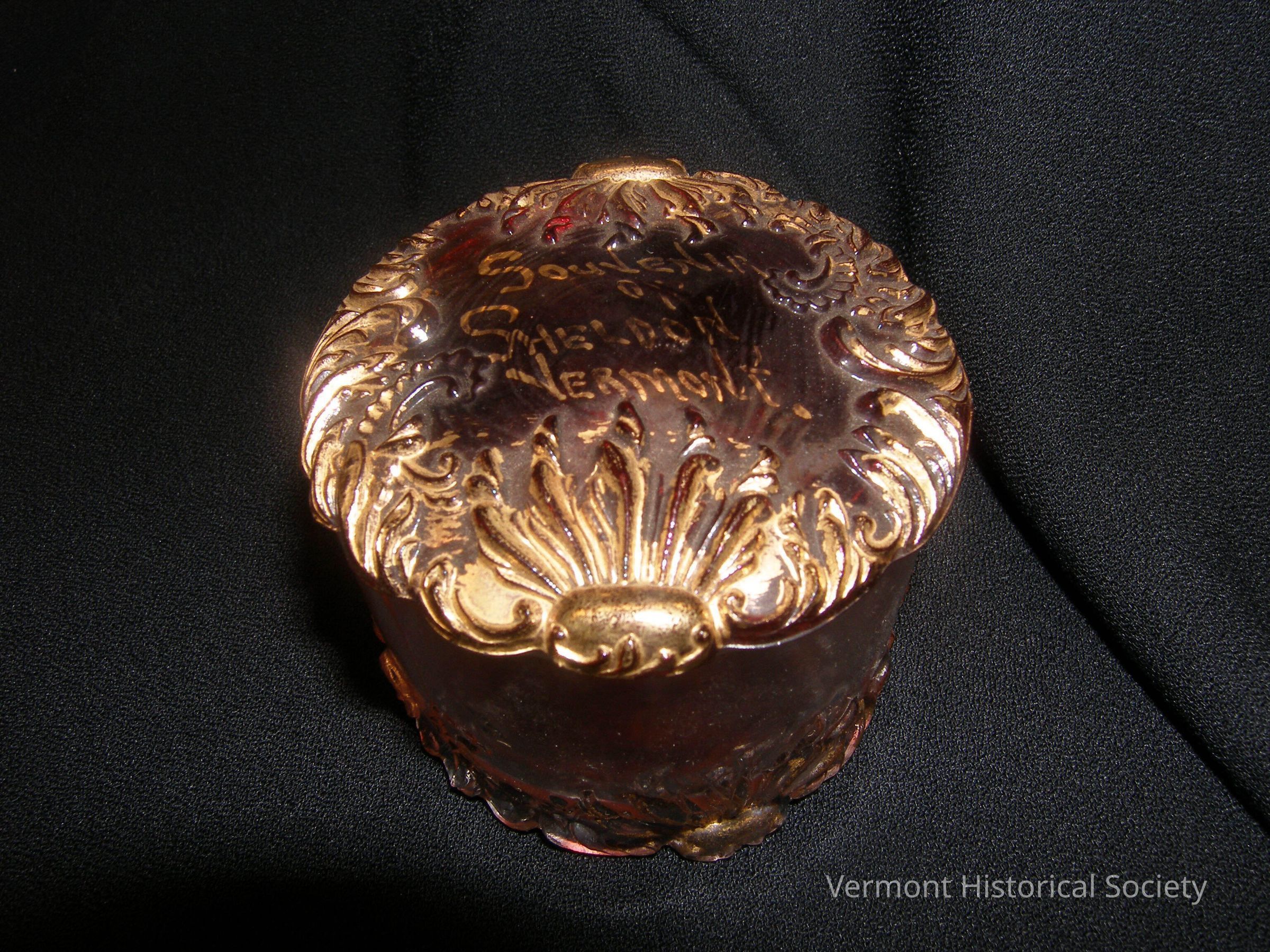 Red glass makeup puff box consisting of a round box and lid. The lid is molded with feathers and shells around the edge, with the raised portions gilded. The center is painted with the inscription, "Souvenir of Sheldon, Vermont." in gold.