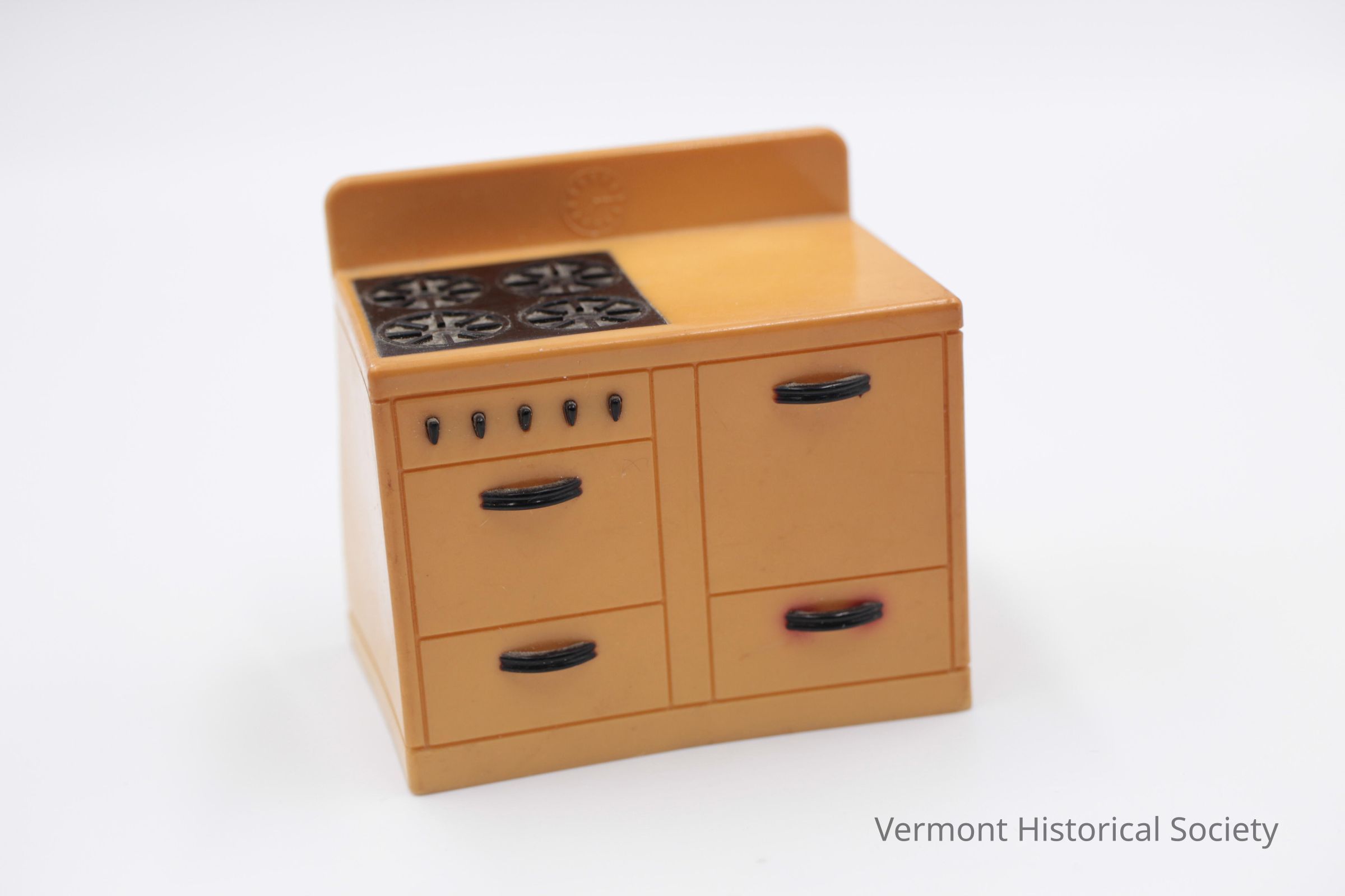 Miniature orange plastic stove and oven sized for a dollhouse. The top has a black range with four burners. The top back is molded with a clock face. The front is molded with four drawers with black handles and five black knobs. The back is hollow and molded with the words "A RENWAL PRODUCT PAT. PEND. U. S. A. & CANADA MADE IN U. S. A."Context
