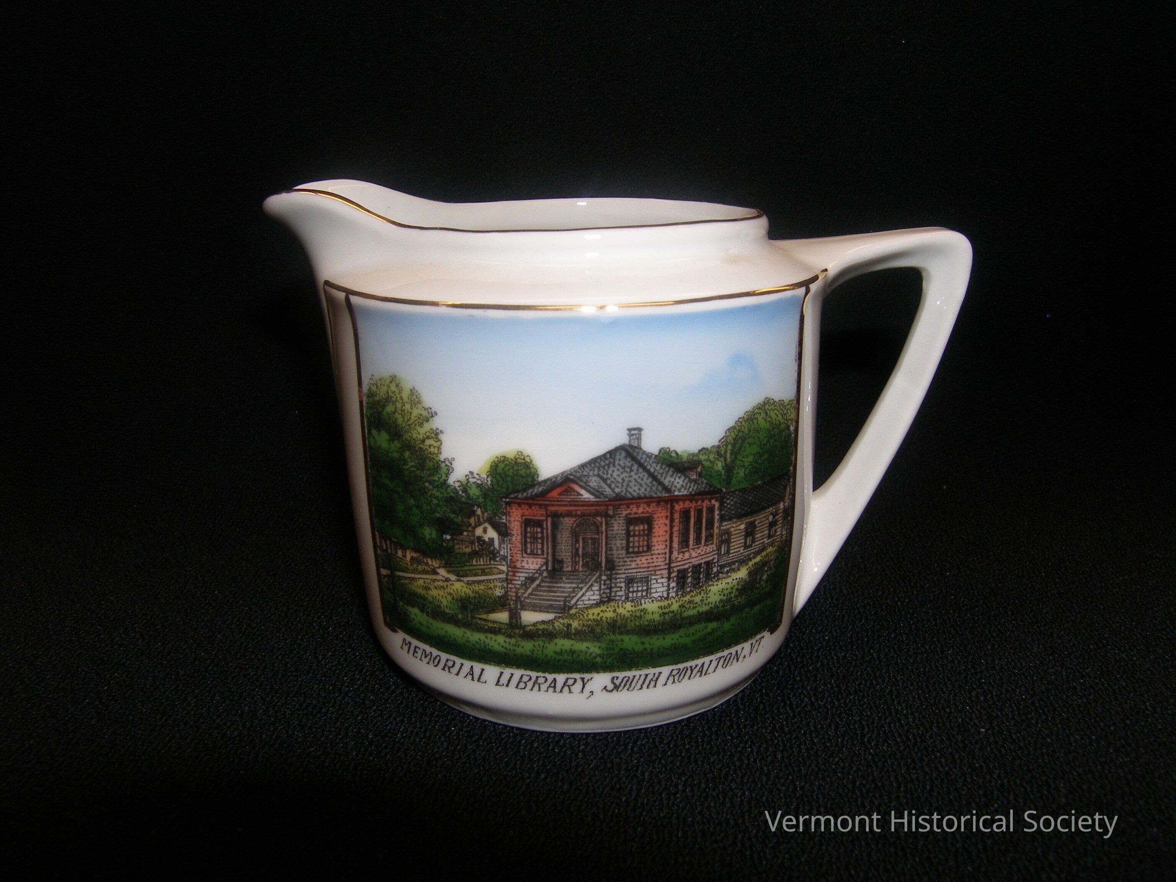 White ceramic cream pitcher printed on one side with a full-color image of a square brick building set among hedges. The image is labeled, "MEMORIAL LIBRARY, SOUTH ROYALTON, VT." The bottom of the pitcher is marked, "Made in Germany for C. M. Edson, South Royalton, Vt."