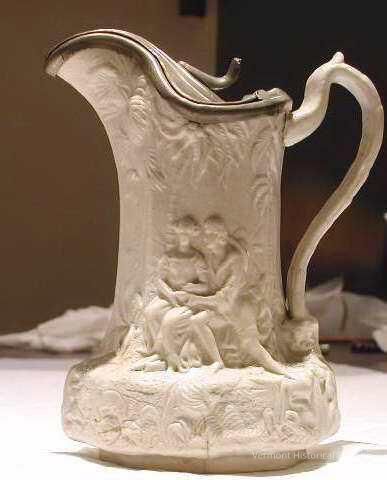 Salt glazed ceramic syrup pitcher molded with a high-relief design of a man and woman sitting among palm trees (likely Paul and Virginia). The woman is wearing neoclassical clothing, and the man is wearing a sailor uniform. The other side shows the man on his knees in front of the standing woman with palm trees in the background. The top is mounted with a pewter lid that hinges open near the handle.