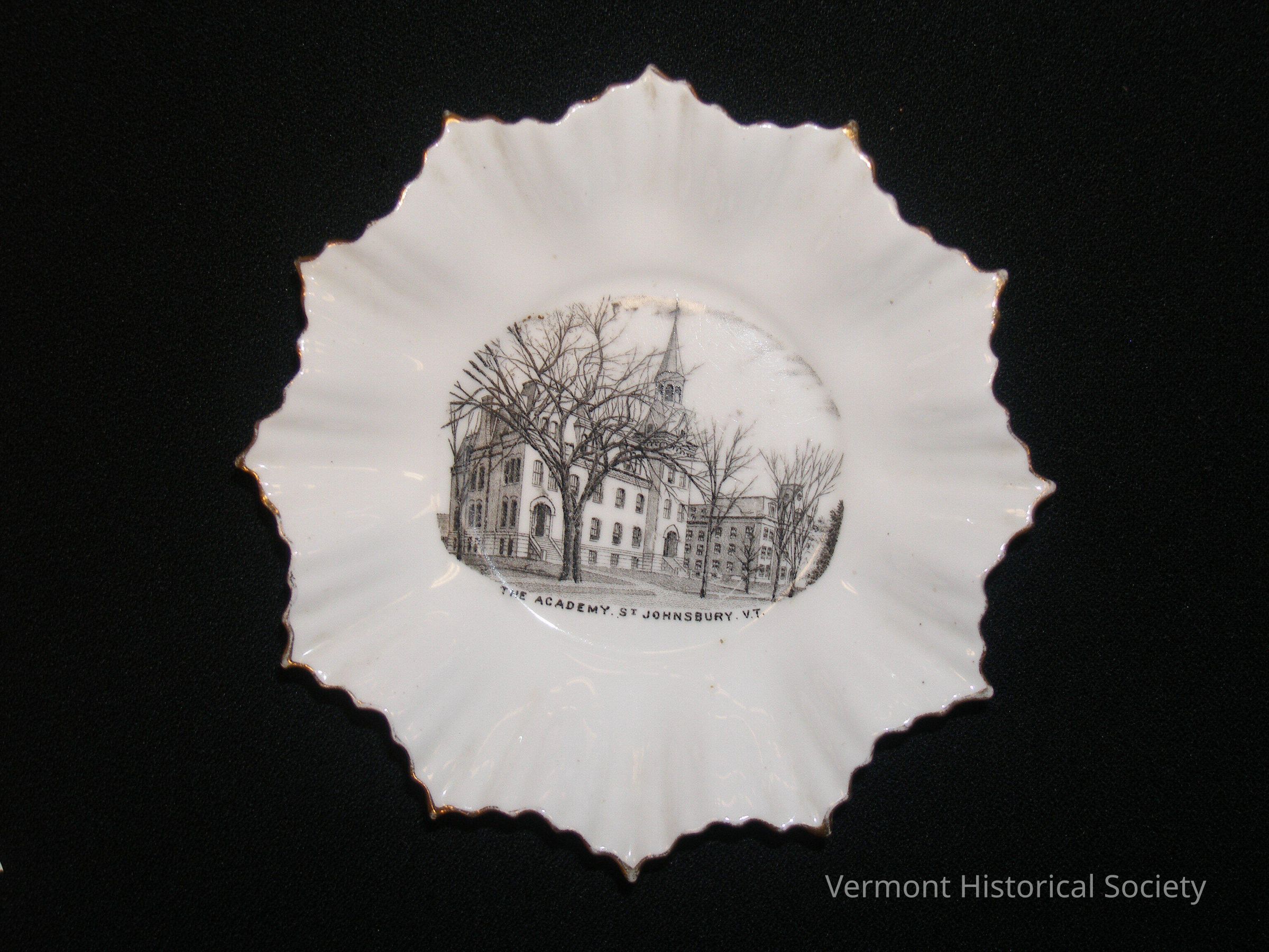 Saucer with scalloped and fluted rim. The center is printed with an engraved illustration of a large building with two entrance stairways on either side and pointed steeple on the right. The image is labeled, "THE ACADEMY, ST. JOHNSBURY, V.T." The bottom of the dish is marked, "ENGLAND", and "MADE IN ENGLAND E & T. FAIRBANKS. ST JOHNSBURY. JM . V & S. B."Context