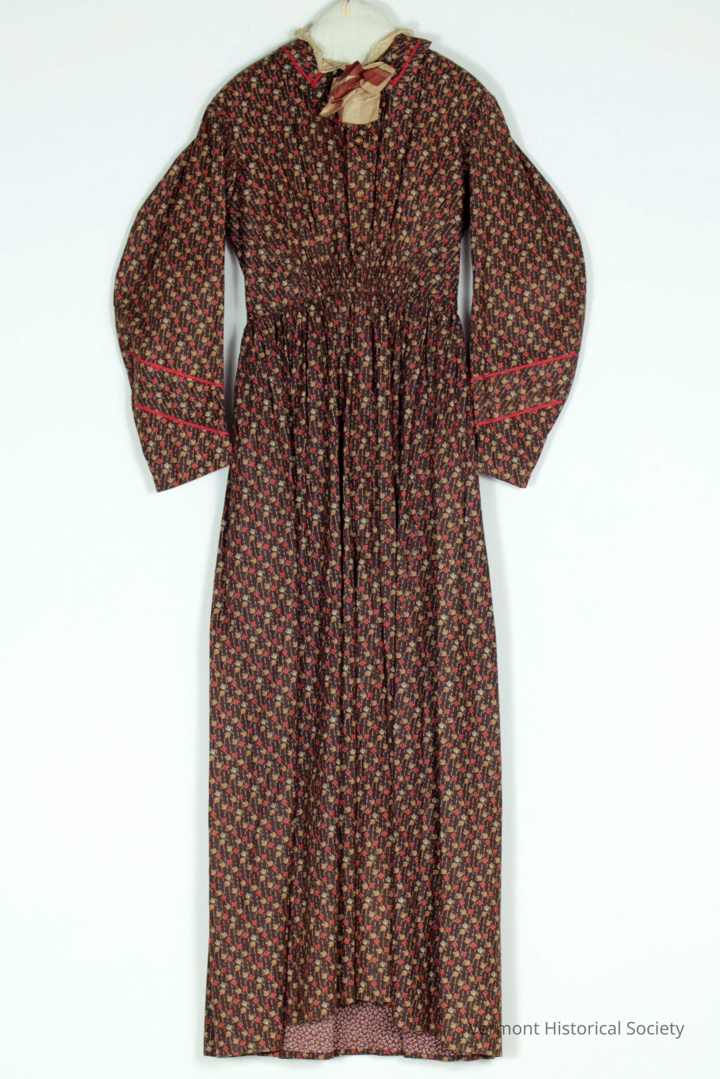 Long-sleeved dress of brown printed cotton (calico). The fabric design consists of small red and tan leaves printed closely together on a striped brown ground. The bodice opens at the center front, securing with hooks and eyes. There is a narrow fall collar trimmed with red woven tape and a narrow band of lace. There is a multi-ribbon bow at the center neckline. The armscyes are low on the shoulder, and the sleeves are cut wide and curved. There is a band of bias-cut fabric edged in red tape encircling the sleeve near the wrist. The skirt is gathered to the bodice.Context