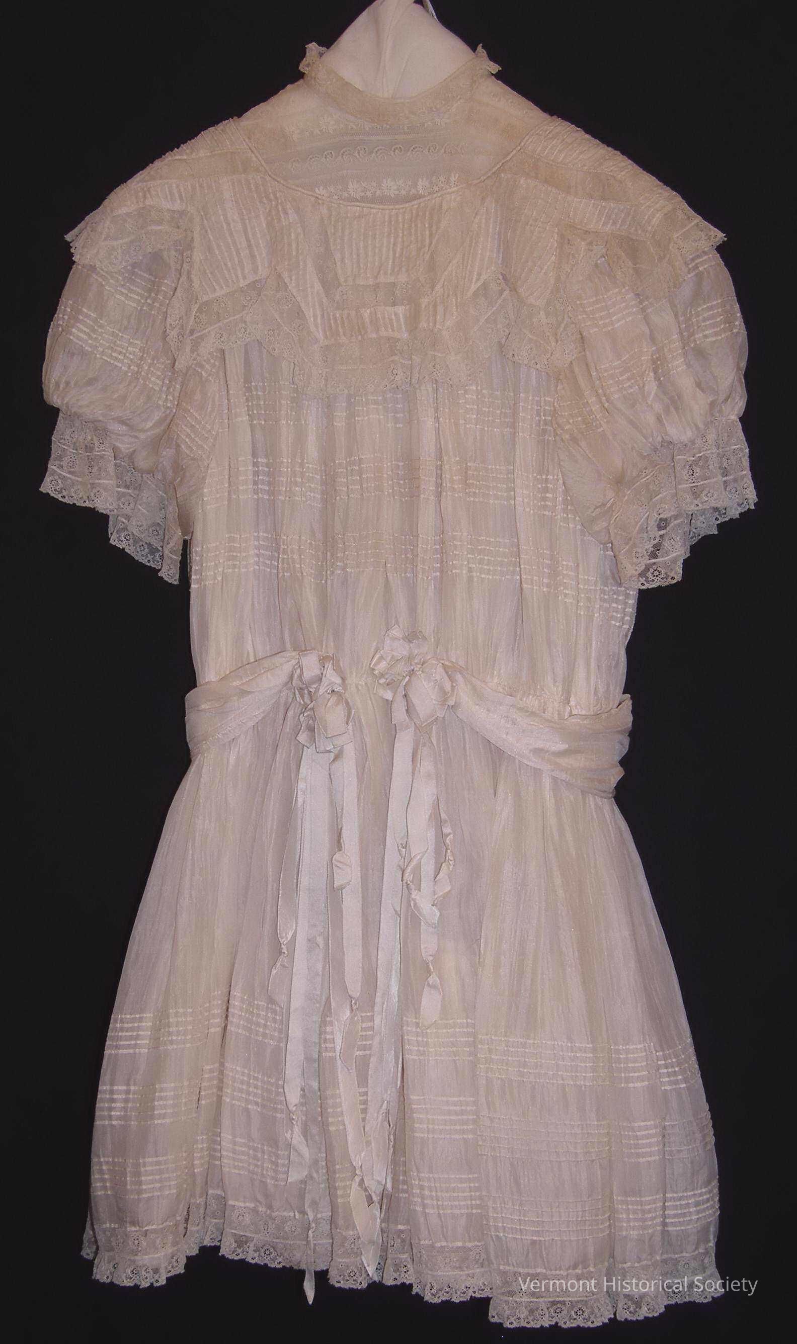 This dress is made from semi-sheer white silk decorated with tiny horizontal tucks forming striped bands of 5 tucks each, and is sized for a young girl. It has lace embellishments around the bodice, neckline, and hemline. The sleeves are short and puffed, with lace at the cuffs. There is a light blue ribbon at the dropped waistline that terminates in 2 bows on either side of the front. The full skirt has 3 layers of silk slips. The dress is accompanied by a pair of bloomer, or pantalets, with lace around the bottom cuffs.Context