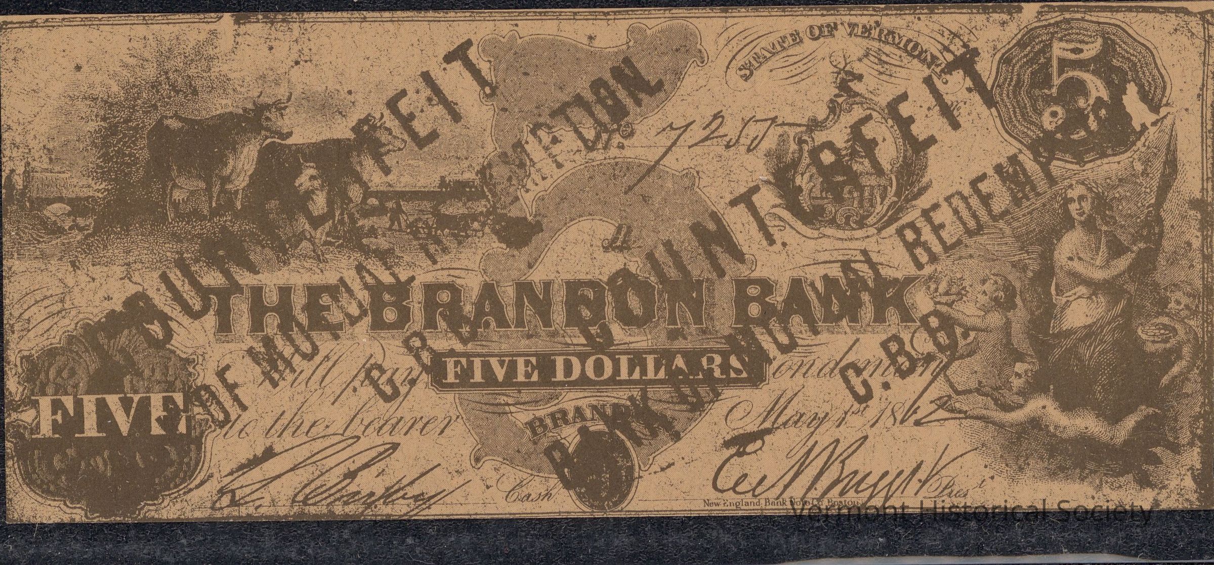 Modern reproduction of a private bank note for 5 dollars from the Brandon Bank. It is stamped all over with the words "COUNTERFEIT / BANK OF MUTUAL REDEMPTION / C.B.B."