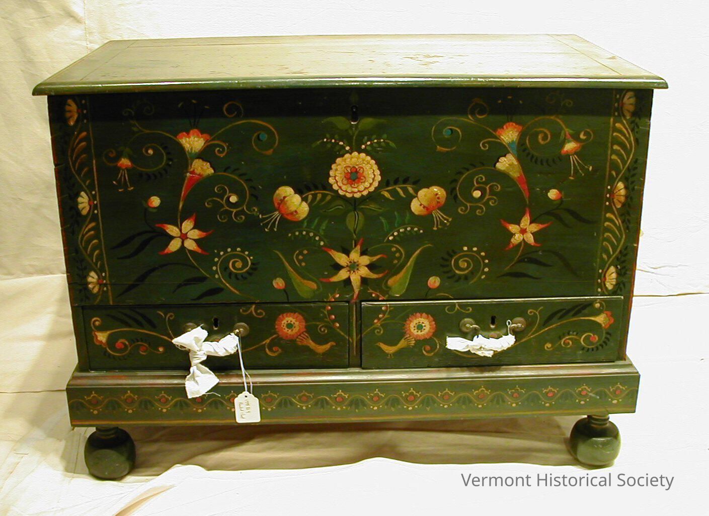 Small blanket chest painted with folk-art-style flowers on a green ground. The chest has a lift top with two exterior doors along the base. It sits on round feet.