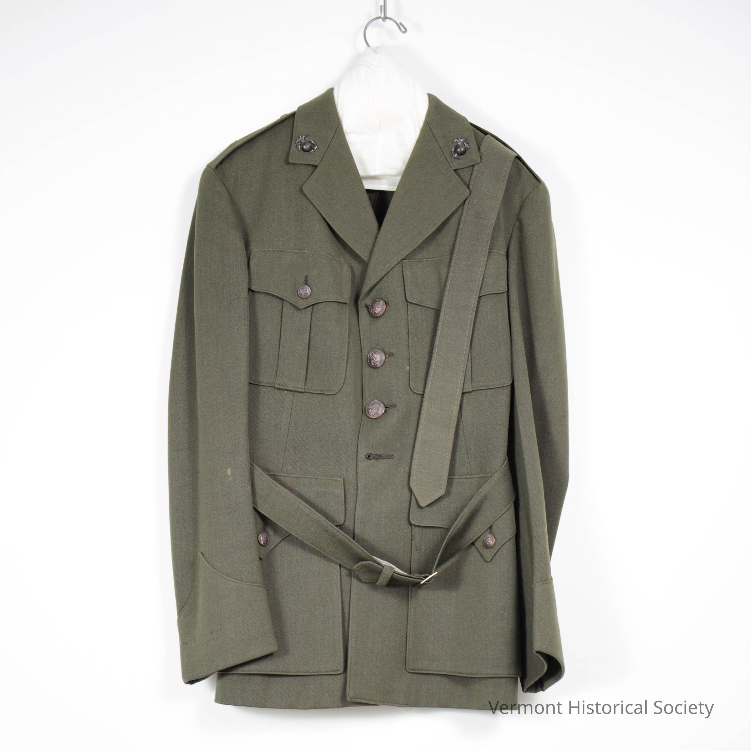 Green wool military uniform tunic with matching belt and necktie. The tunic has a lapel collar with petals pins in the shape of a globe over an anchor with an eagle. The garment secures up the center front with four metal buttons. There are four front pockets: two at the breast and two at the hips. A belt secures over the tunic at the waist and has a simple rectangular buckle.