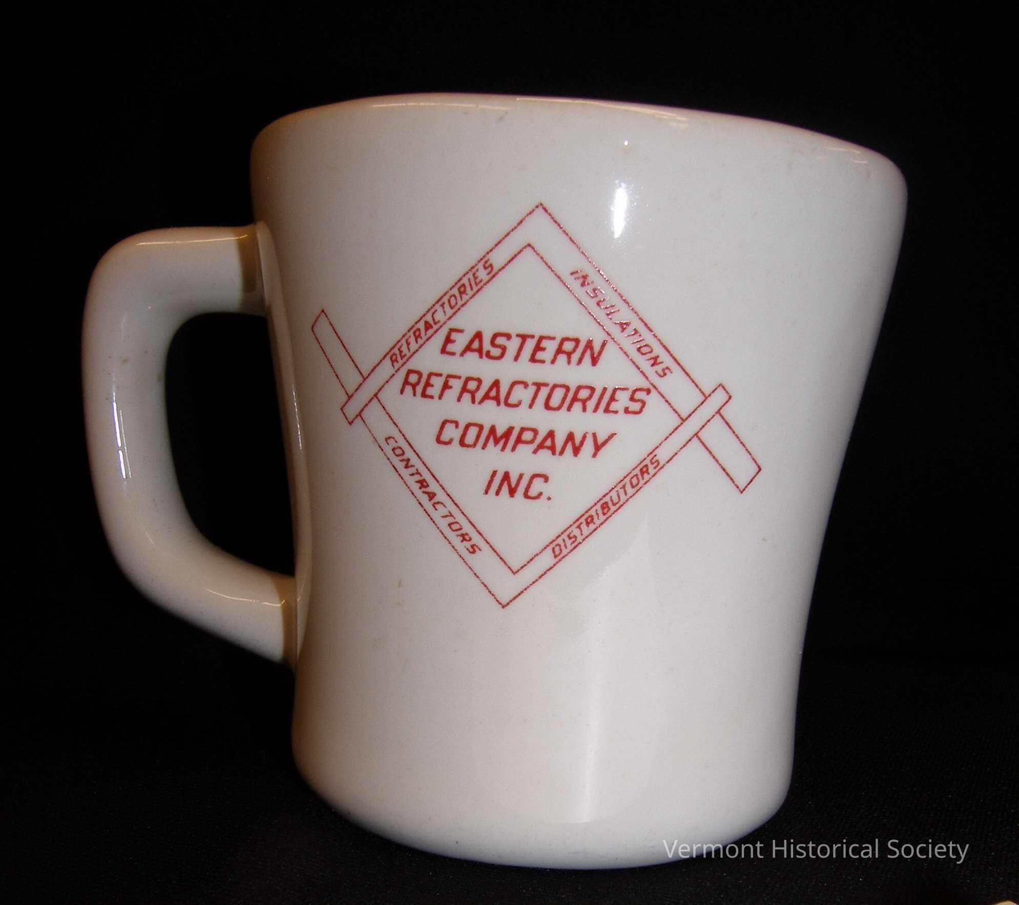 White ceramic diner-style coffee mug printed in red with the inscription "EASTERN REFRACTORIES COMPANY INC. in the center of two crossed framing squares that read, "REFRACTORIES INSULATIONS CONTRACTORS DISTRIBUTORS".