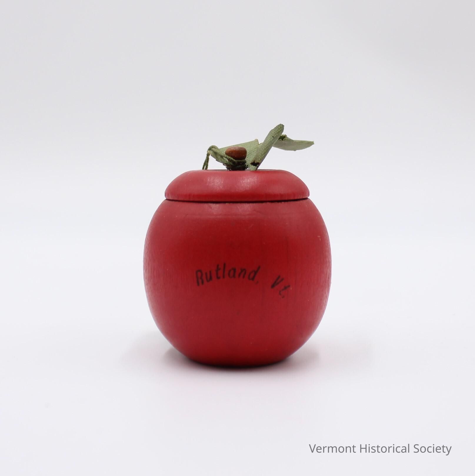 Wooden ring box in the shape of an apple. The box is painted red and the words, "Rutland, Vt." are printed on one side. The center of the lid has a brown wooden peg with green fabric leaves. A round, green cardboard tag is attached to the peg with a green string and is printed with the inscription, "A LOSER YOU WILL NEVER BE IF YOU PLACE YOUR RING INSIDE OF ME".Context