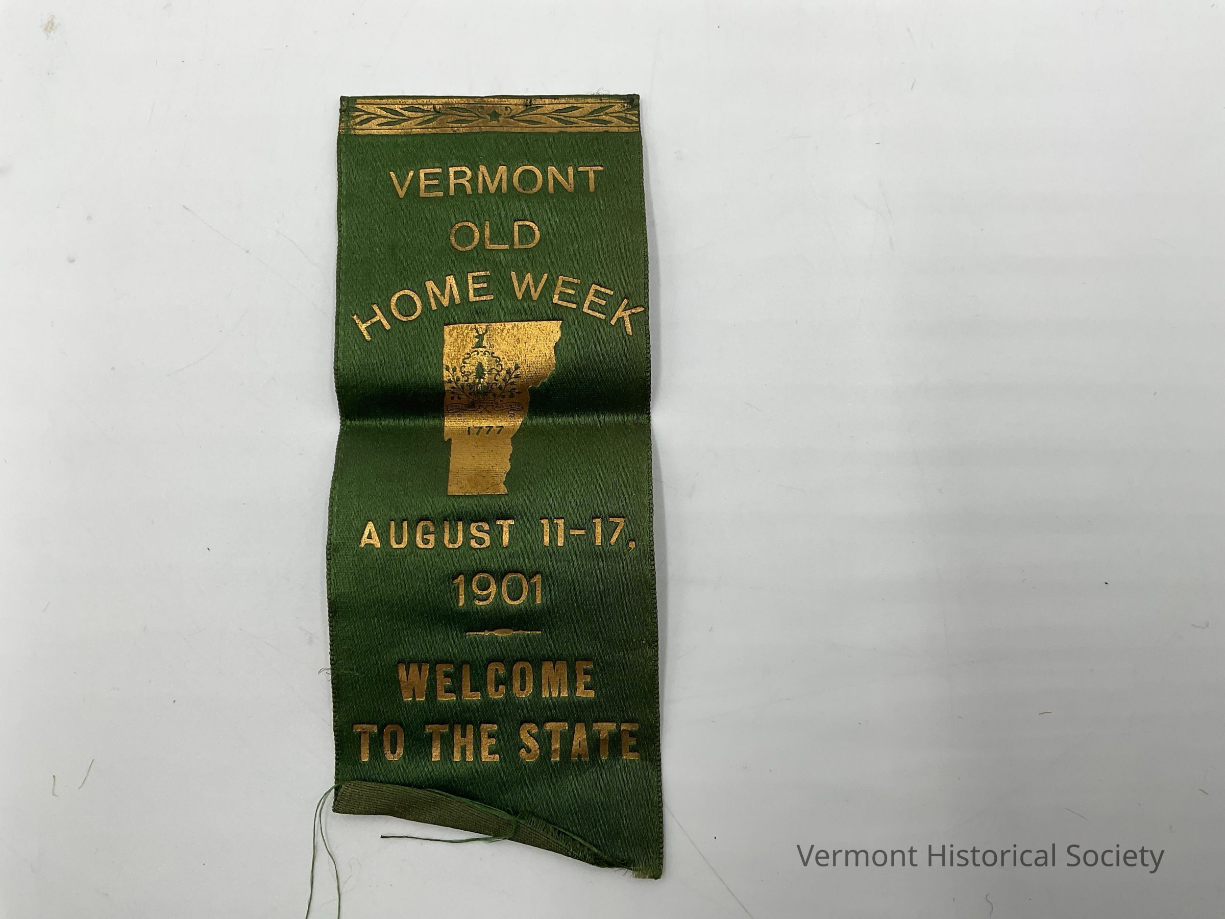 Green ribbon with gold print and the image of the state of Vermont. It says, "Vermont Old Home Week, August 11-17, 1901, Welcome to the State."Acquisition