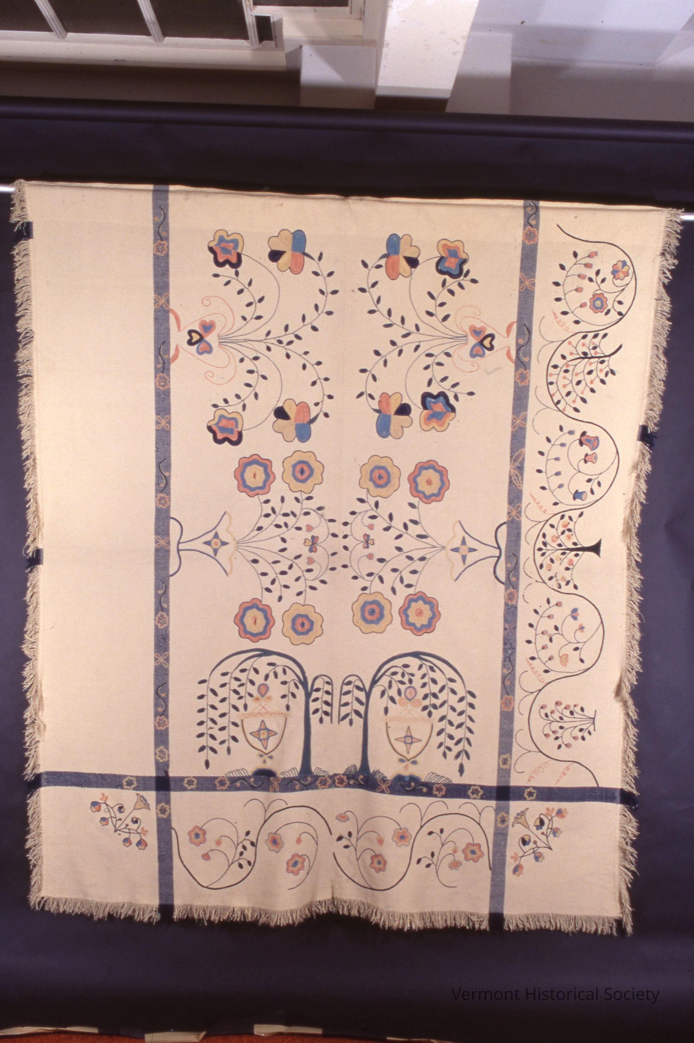 Embroidered counterpane. The design is embroidered with wool threads on a wool, twill-woven blanket. The blue stripes are woven, and there are flowers embroidered along the stripes. The design consists of two willow trees and four floral bouquets in the central pane, and floral vines in the right and bottom edge sections. The embroidery is done in shades of green, yellow, blue, and pink. There is fringe on three sides.Context