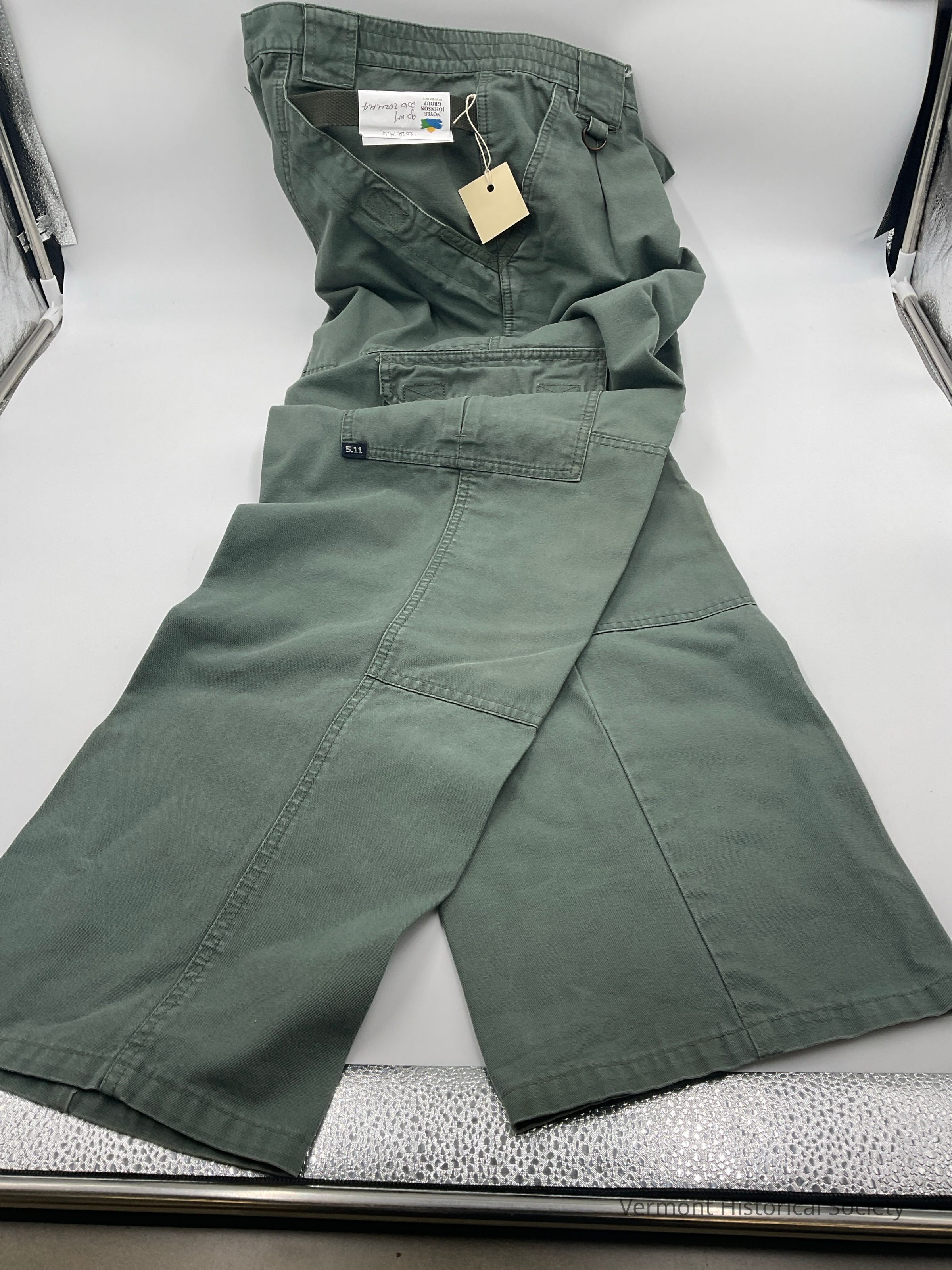Green cargo pants with high and low pockets on the legs.Acquisition