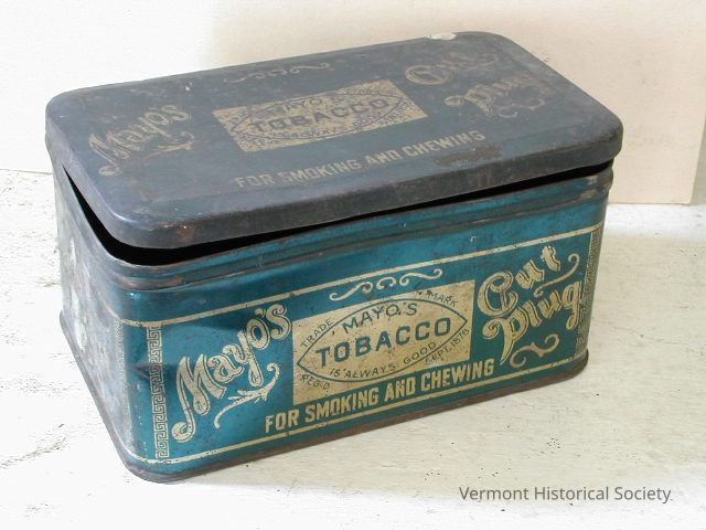 Rectangular metal tobacco canister labeled, "Mayo's Cut Plug / MAYO'S TOBACCO IS ALWAYS GOOD".