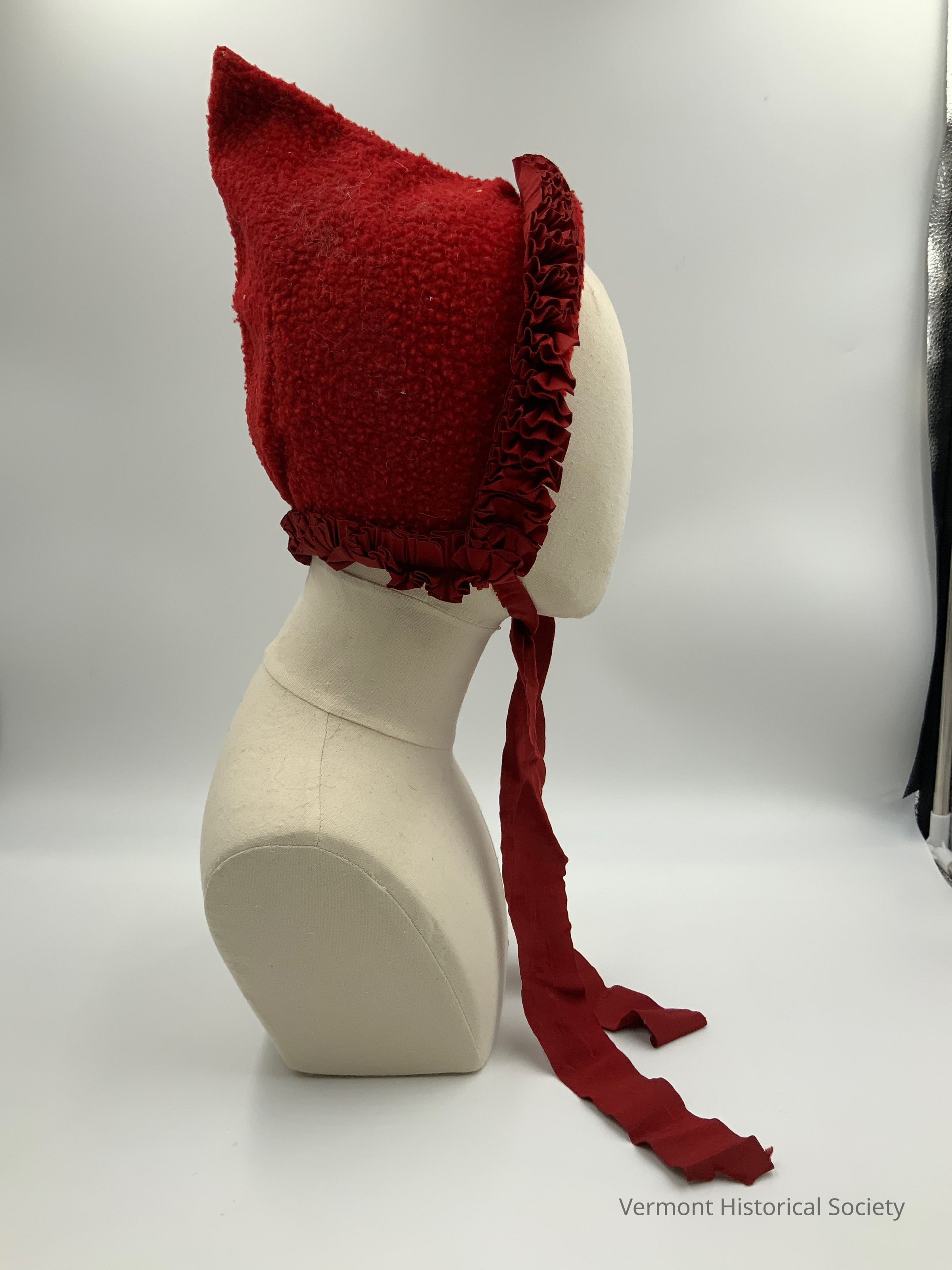 Red wool bonnet or cap with pointed crown. The edge is trimmed with pleated ruffles. There are two ribbons that tie under the wearer's chin.