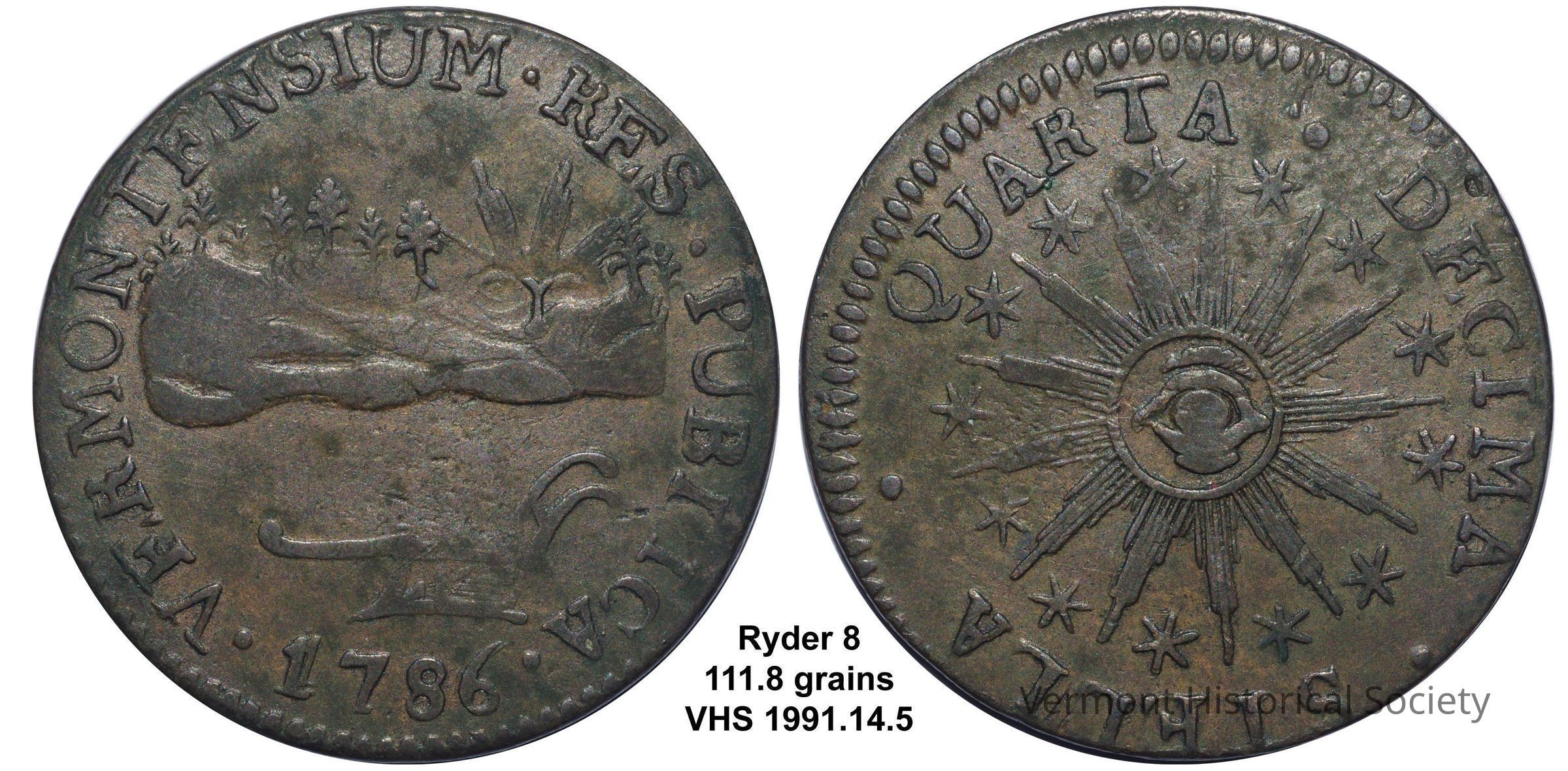 Copper coin with a radiating eye on one side and a pictorial scene on the other. The eye side shows a detailed human eye with 13 rays emitting from it in every direction. Between each ray is a 6-petaled flower (13 in total). The words, "STELLA QUARTA DECIMA" ring the edge. The reverse shows a scene of a plow in a field with a line of hills and trees on the horizon. A sun with two eyes and a prominent nose peeks over the horizon. The words "VERMONTENSIUM RES PUBLICA 1786" ring the edge.