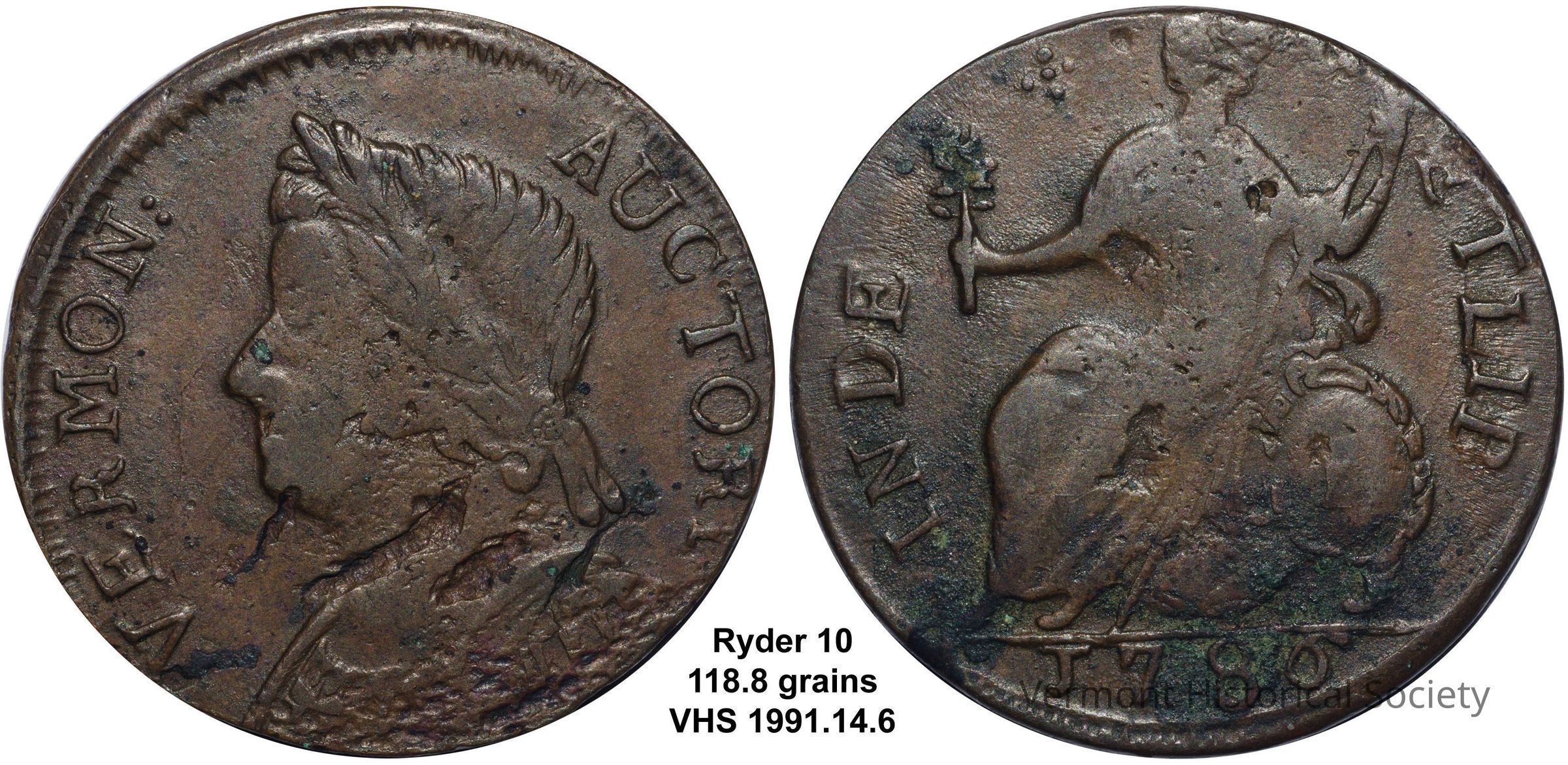 Copper coin with a bust on one side and the allegorical figure, Columbia, on the other. The face side shows a left-facing bust of a Roman figure resembling George II of England, wearing a laurel wreath on his head, tied with a ribbon at the nape of his neck, and military armor. The words "VERMON AUCTORI" ring the edge. On the reverse, Columbia is shown swathed in loose fabric, seated next to a shield bearing the Union flag. She is holding a staff with a liberty cap in her left hand, and a small branch in her right hand. The date 1786 is at the bottom center.Context