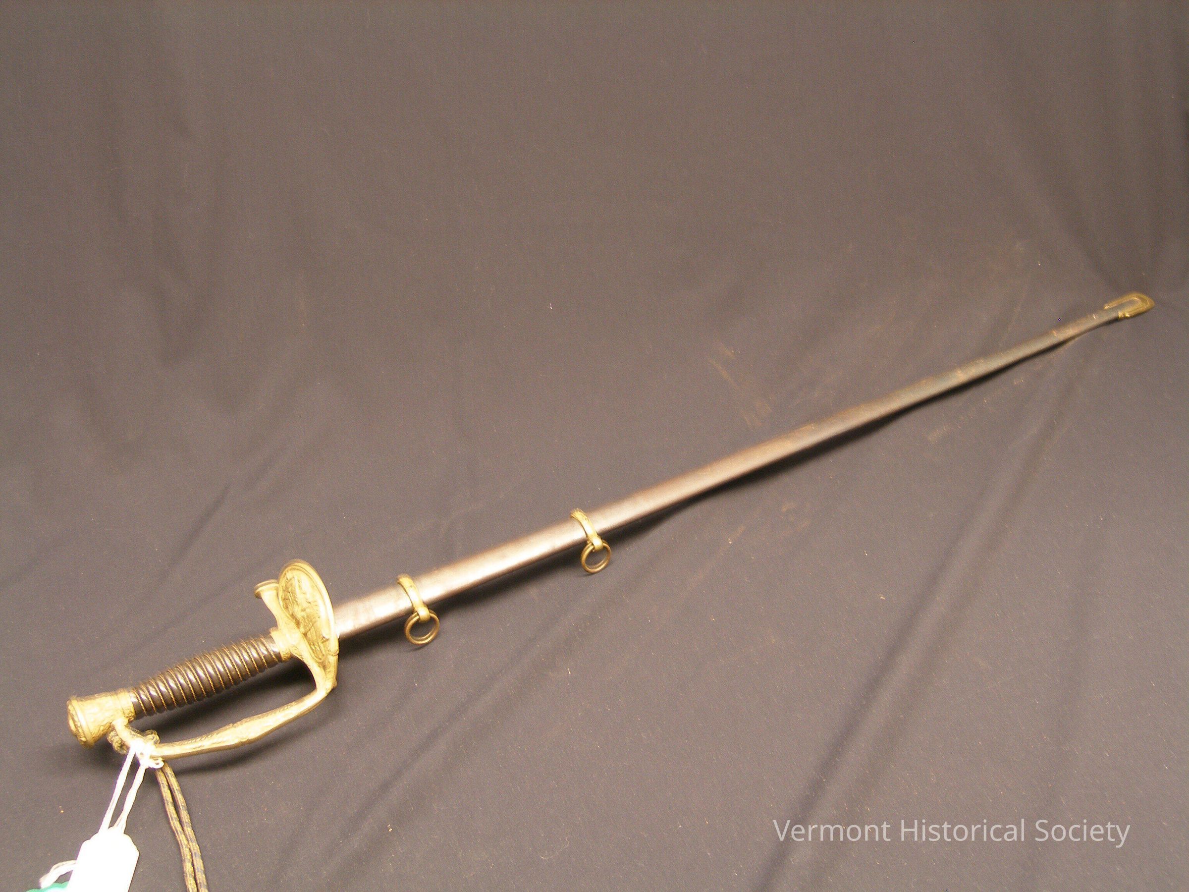 Straight-bladed sword and engraved scabbard. The grip is black metal decorated with brass wire. The brass guard is molded in low relief to show an eagle.