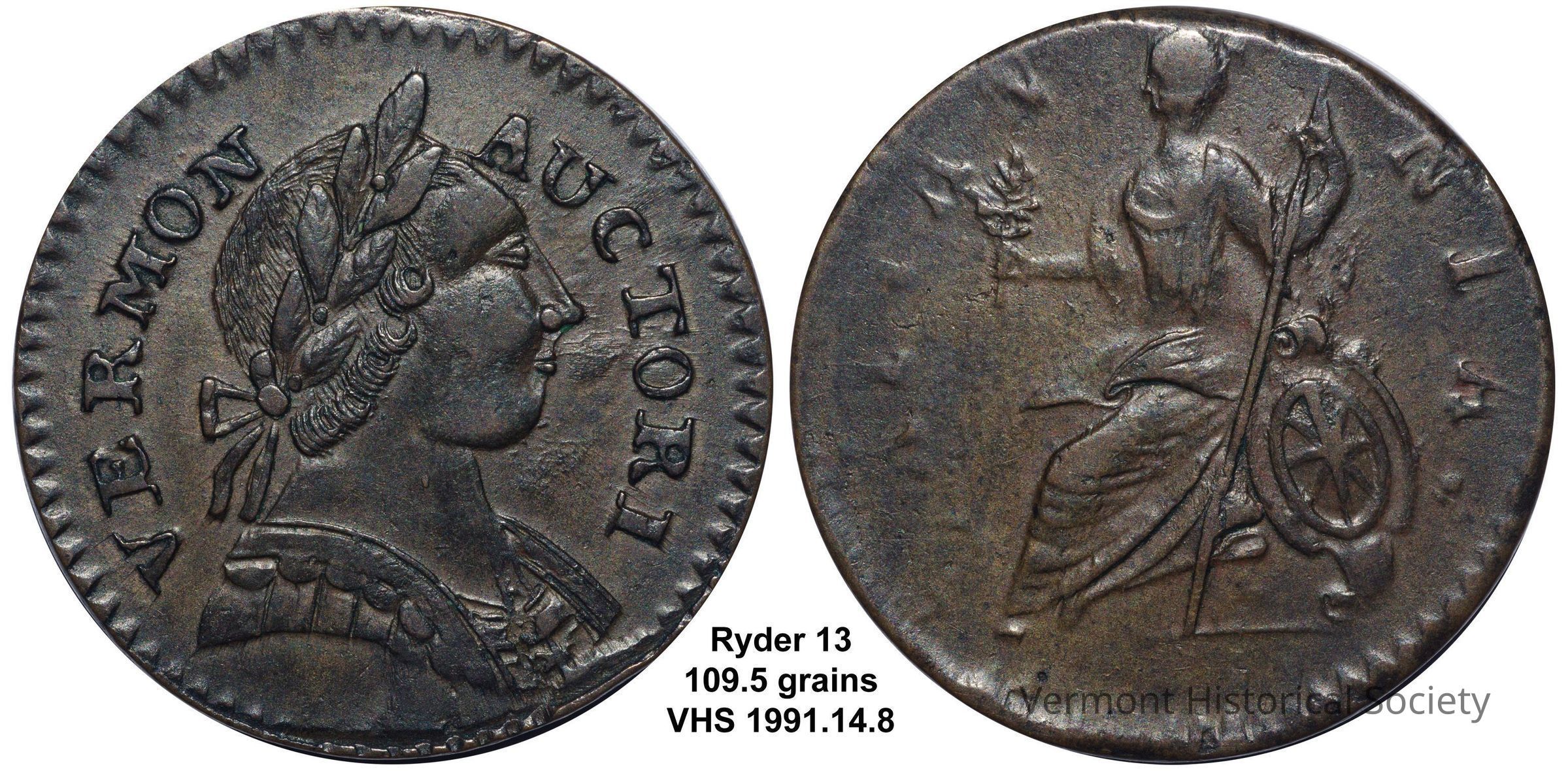 Copper coin with a bust on one side and the allegorical figure, Columbia, on the other. The face side shows a right-facing bust of a Roman figure, wearing a laurel wreath on his head, tied with a ribbon at the nape of his neck, and military armor. The words "VERMON AUCTORI" ring the edge. On the reverse, Britannia is shown swathed in loose fabric, seated next to a shield bearing the Union flag. She is holding a staff with a liberty cap in her left hand, and a small branch in her right hand. The words "BRITANNIA" rings the edge.Context