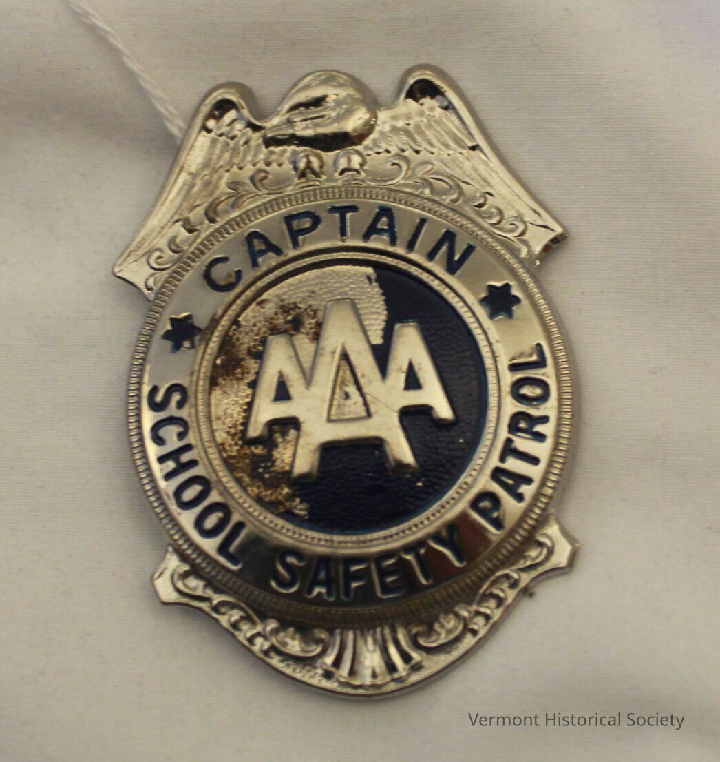Silver-toned metal badge consisting of a circle topped with an eagle. The initials AAA are molded into the center of the circle, over a mottled ground painted black (paint now largely missing). The border of the circle bears the inscription, "CAPTAIN SCHOOL SAFETY PATROL".