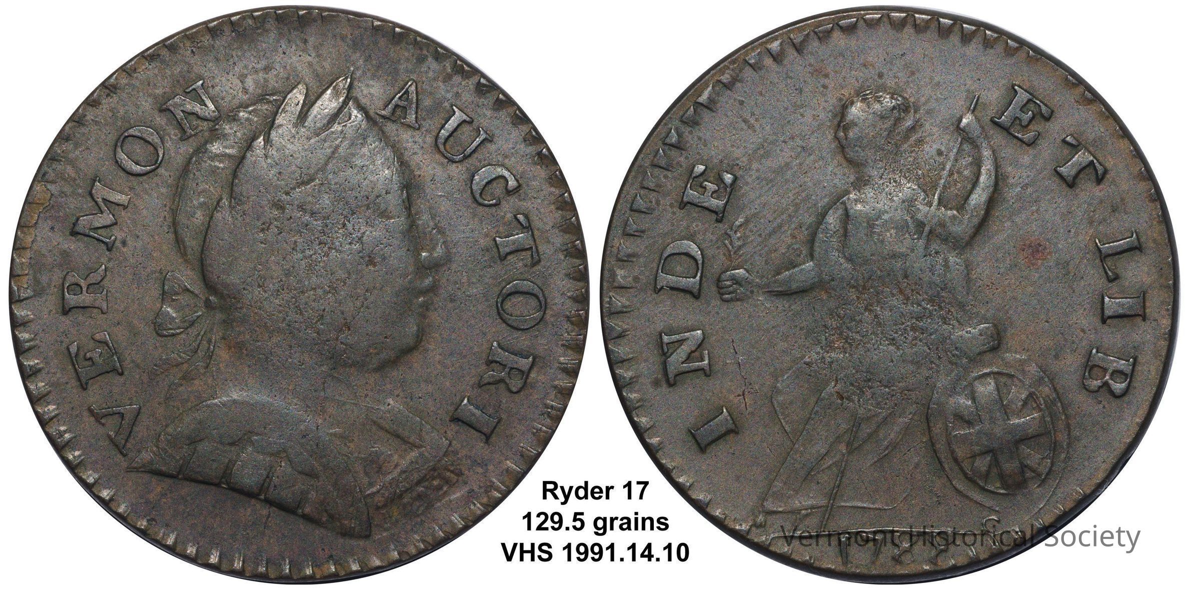 Copper coin with a bust on one side and the allegorical figure, Columbia, on the other. The face side shows a right-facing bust of a Roman figure, wearing a laurel wreath on his head, tied with a ribbon at the nape of his neck, and military armor. The words "VERMON AUCTORI" ring the edge. On the reverse, Columbia is shown swathed in loose fabric, seated next to a shield bearing the Union flag. She is holding a staff with a liberty cap in her left hand, and a small branch in her right hand. The words "INDE ET LIB 1788" ring the edge.Context