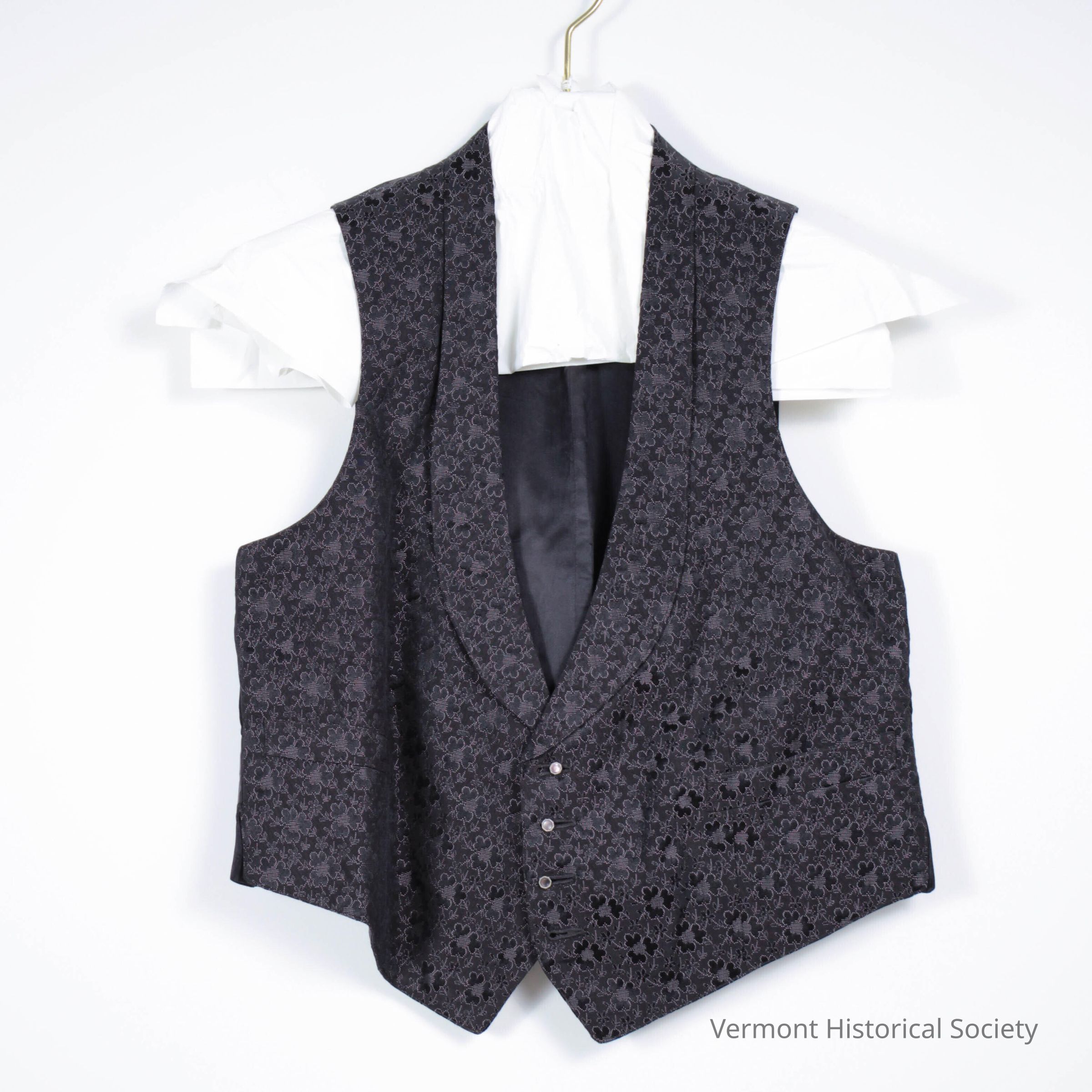 Black silk brocade vest. The fabric is woven in a repeating pattern of three-petaled flowers. The vest has a shawl collar and secures at the center front with four small, metal buttons. There are pockets on either side of the vest front. It is lined with black satin-woven silk.